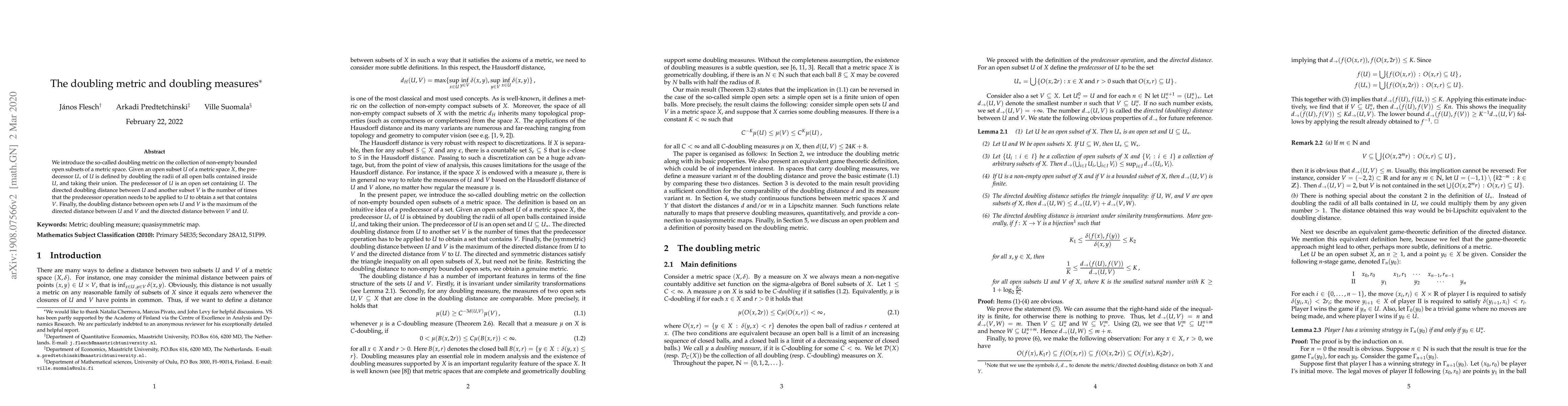 We introduce the so--called doubling metric on the collection of non--empty bounded open subsets of a metric space. Given a subset $U$ of a metric space $X$, the predecessor $U_{*}$ of $U$ is defined by doubling the radii of all open balls contained inside $U$, and taking their union. If $U$ is open, the predecessor of $U$ is an open set containing $U$. The directed doubling distance between $U$ and another subset $V$ is the number of times that the predecessor operation needs to be applied to $U$ to obtain a set that contains $V$. Finally, the doubling distance between $U$ and $V$ is the maximum of the directed distance between $U$ and $V$ and the directed distance between $V$ and $U$.