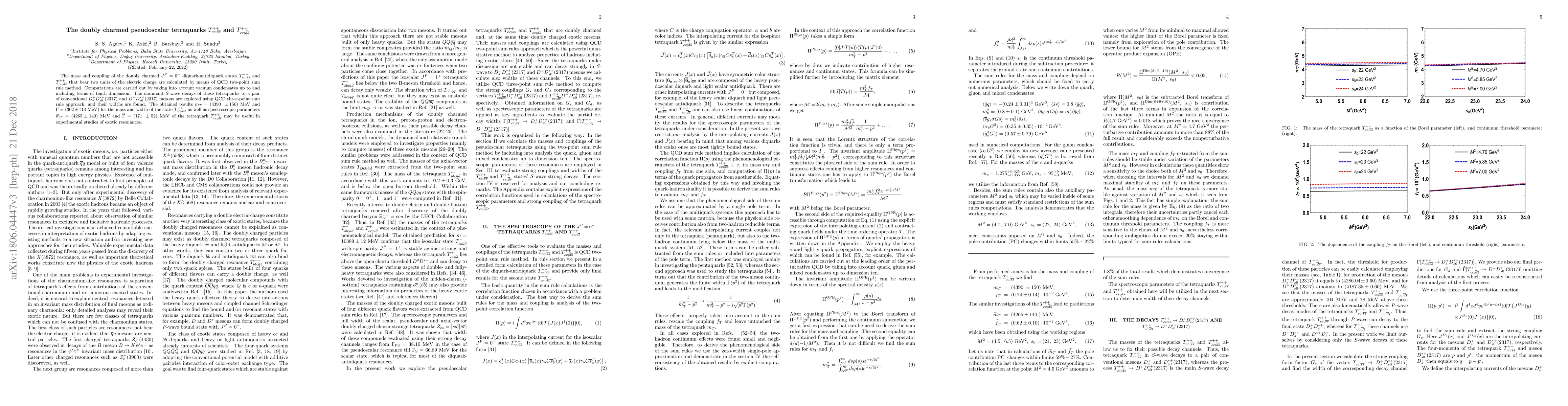 The mass and coupling of the doubly charmed $J^P=0^{-}$ diquark-antidiquark states $T_{cc;\bar{s} \bar{s}}^{++}$ and $T_{cc;\bar{d} \bar{s}}^{++}$ that bear two units of the electric charge are calculated by means of QCD two-point sum rule method. Computations are carried out by taking into account vacuum condensates up to and including terms of tenth dimension. The dominant $S$-wave decays of these tetraquarks to a pair of conventional $ D_{s}^{+}D_{s0}^{\ast +}(2317)$ and $D^{+}D_{s0}^{\ast +}(2317)$ mesons are explored using QCD three-point sum rule approach, and their widths are found. The obtained results $m_{T}=(4390~\pm 150)~\mathrm{MeV}$ and $\Gamma =(302 \pm 113~\mathrm{MeV}$) for the mass and width of the state $T_{cc;\bar{ s} \bar{s}}^{++}$, as well as spectroscopic parameters $\widetilde{m} _{T}=(4265\pm 140)~\mathrm{MeV}$ and $\widetilde{\Gamma }=(171~\pm 52)~ \mathrm{MeV}$ of the tetraquark $T_{cc;\bar{d} \bar{s}}^{++}$ may be useful in experimental studies of exotic resonances.