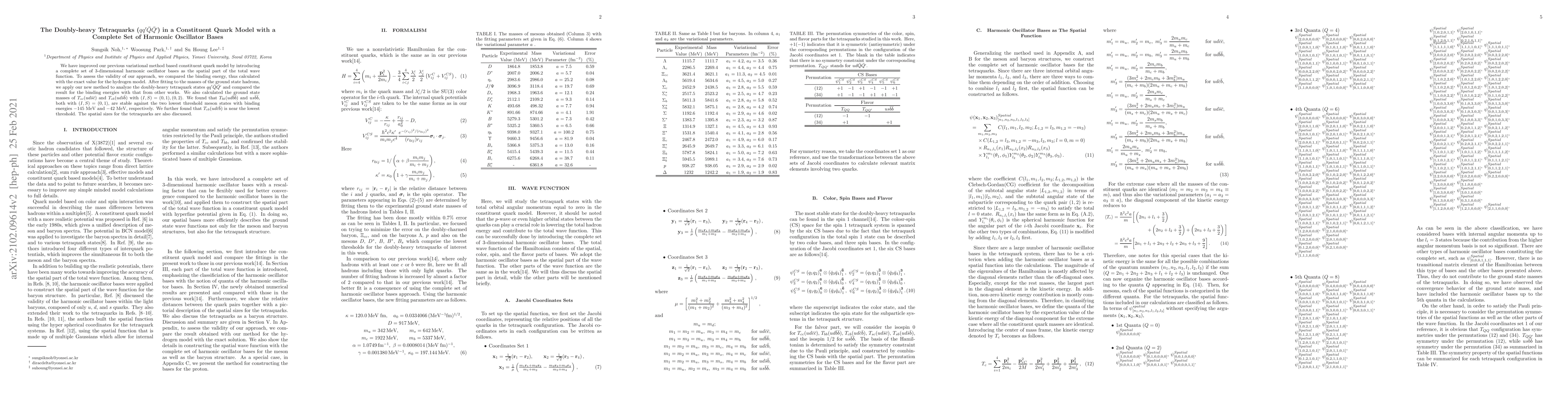We have improved our previous variational method based constituent quark model by introducing a complete set of 3-dimensional harmonic oscillator bases as the spatial part of the total wave function. To assess the validity of our approach, we compared the binding energy, thus calculated with the exact value for the hydrogen model. After fitting to the masses of the ground state hadrons, we apply our new method to analyze the doubly-heavy tetraquark states $qq'\bar{Q}\bar{Q'}$ and compared the result for the binding energies with that from other works. We also calculated the ground state masses of $T_{sc} (ud\bar{s}\bar{c})$ and $T_{sb} (ud\bar{s}\bar{b})$ with $(I,S) = (0,1), (0,2)$. We found that $T_{bb} (ud\bar{b}\bar{b})$ and $us\bar{b}\bar{b}$, both with $(I,S) = (0,1)$, are stable against the two lowest threshold meson states with binding energies $-145$ MeV and $-42$ MeV, respectively. We further found that $T_{cb} (ud\bar{c}\bar{b})$ is near the lowest threshold. The spatial sizes for the tetraquarks are also discussed.