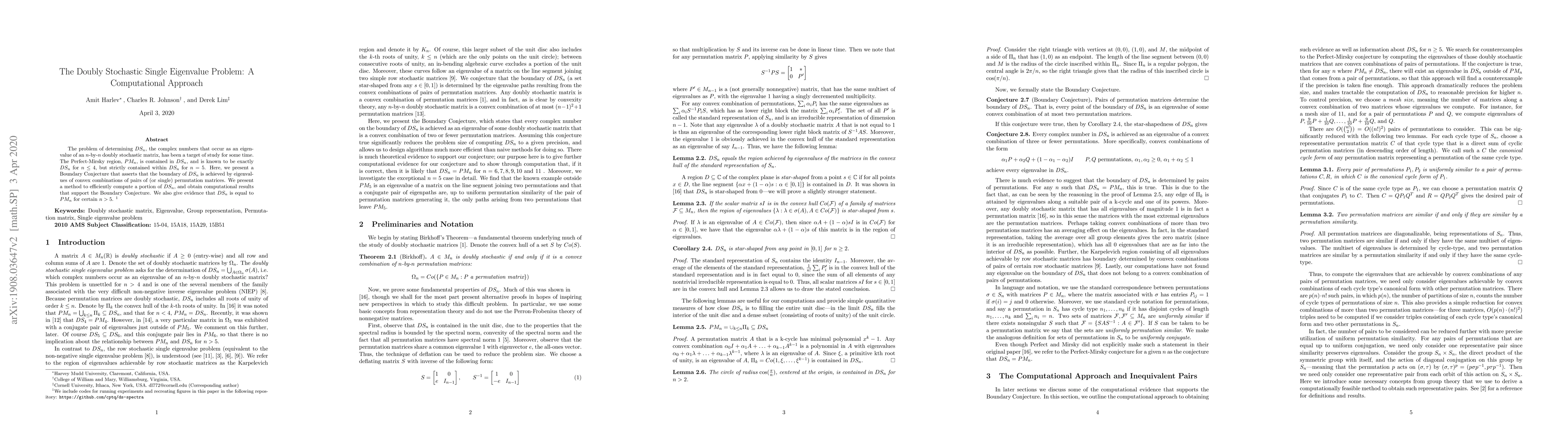 The problem of determining $DS_n$, the complex numbers that occur as an eigenvalue of an $n$-by-$n$ doubly stochastic matrix, has been a target of study for some time. The Perfect-Mirsky region, $PM_n$, is contained in $DS_n$, and is known to be exactly $DS_n$ for $n \leq 4$, but strictly contained within $DS_n$ for $n = 5$. Here, we present a Boundary Conjecture that asserts that the boundary of $DS_n$ is achieved by eigenvalues of convex combinations of pairs of (or single) permutation matrices. We present a method to efficiently compute a portion of $DS_n$, and obtain computational results that support the Boundary Conjecture. We also give evidence that $DS_n$ is equal to $PM_n$ for certain $n > 5$.