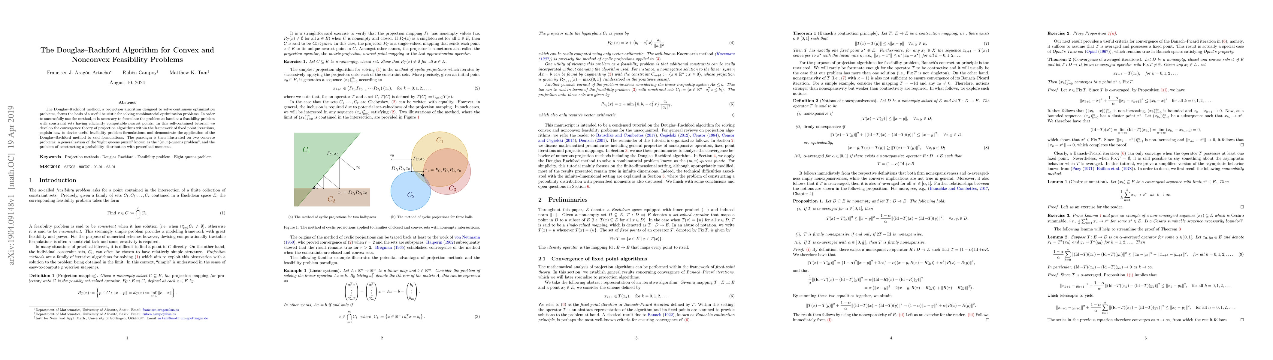 This paper presents the Douglas-Rachford method for solving both convex and nonconvex feasibility problems, detailing the convergence theory and practical application of projection algorithms. It illustrates the method's effectiveness through the "(m,n)-queens problem" and the construction of probability distributions with prescribed moments.