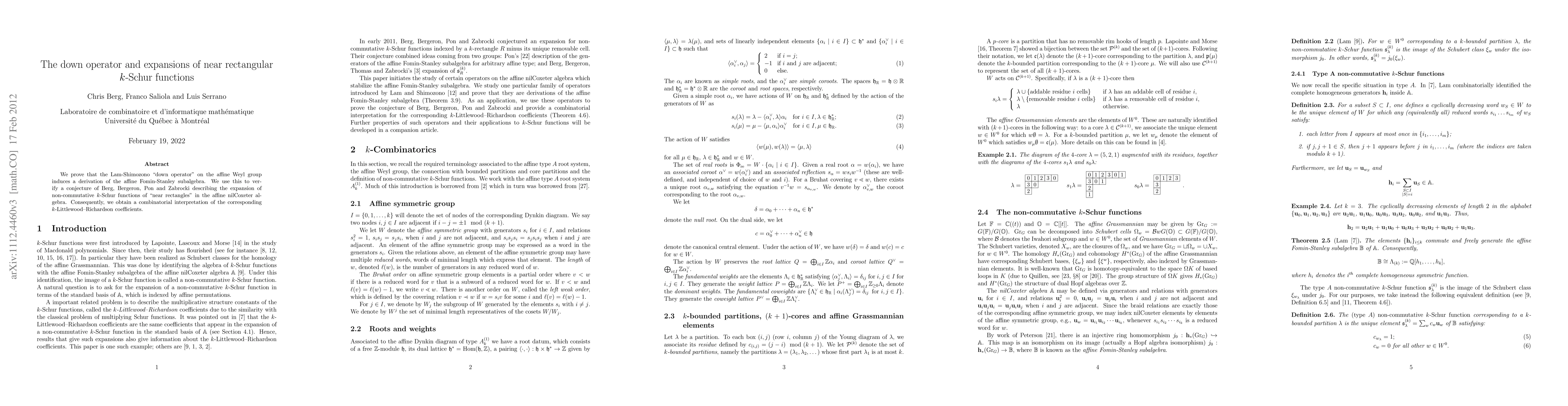 We prove that the Lam-Shimozono "down operator" on the affine Weyl group induces a derivation of the affine Fomin-Stanley subalgebra of the affine nilCoxeter algebra. We use this to verify a conjecture of Berg, Bergeron, Pon and Zabrocki describing the expansion of k-Schur functions of "near rectangles" in the affine nilCoxeter algebra. Consequently, we obtain a combinatorial interpretation of the corresponding k-Littlewood--Richardson coefficients.