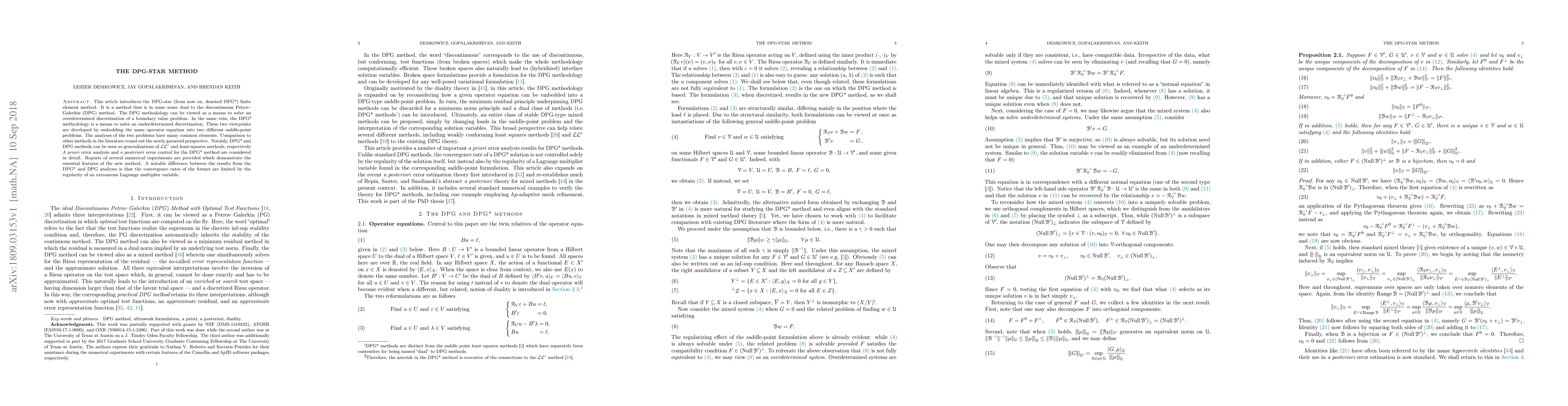 The DPG-star method (DPG$^*$) is introduced as a dual finite element method to the discontinuous Petrov-Galerkin (DPG) method, designed to solve underdetermined discretizations. It is compared to $\mathcal{L}\mathcal{L}^\ast$ and least-squares methods, and detailed a priori and a posteriori error analyses are provided, with numerical experiments showing convergence rates limited by an extraneous Lagrange multiplier variable.