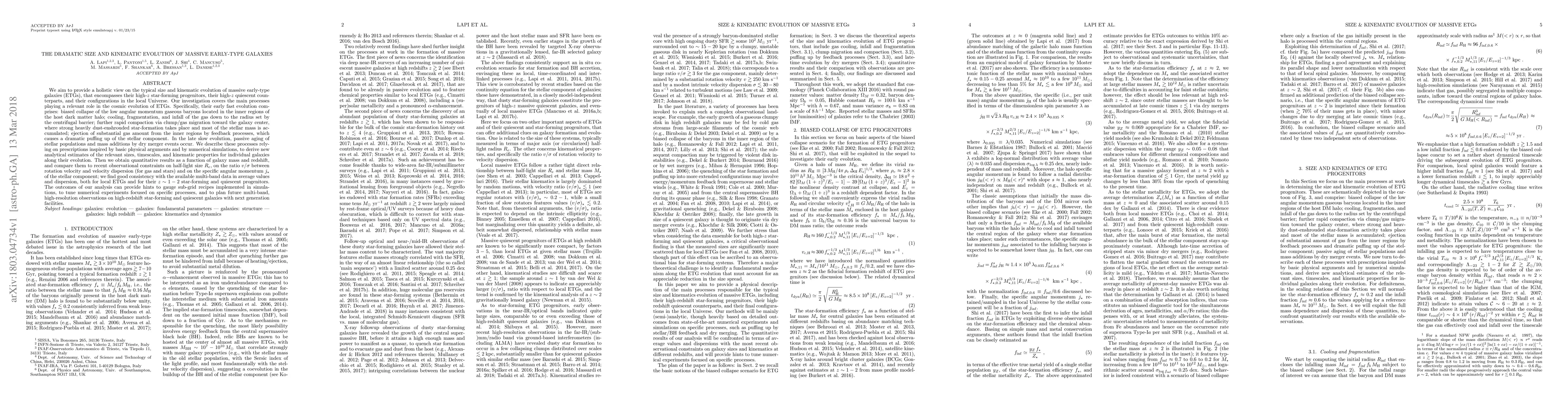 This paper investigates the size and kinematic evolution of massive early-type galaxies (ETGs) from their high-$z$ star-forming and quiescent progenitors to their configurations in the local Universe. It finds good consistency between analytical models and observational data on galaxy sizes, rotation velocities, and stellar angular momentum.