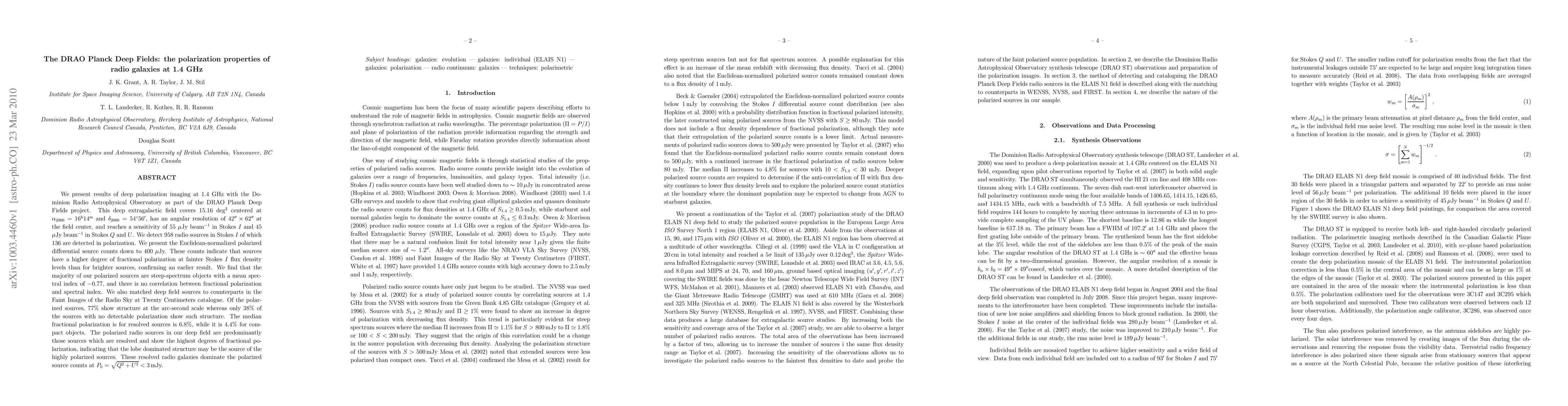 We present results of deep polarization imaging at 1.4 GHz with the Dominion Radio Astrophysical Observatory as part of the DRAO Planck Deep Fields project. This deep extragalactic field covers 15.16 square degrees centered at RA = 16h 14m and DEC = 54d 56', has an angular resolution of 42" x 62" at the field center, and reaches a sensitivity of 55 microJy/beam in Stokes I and 45 microJy/beam in Stokes Q and U. We detect 958 radio sources in Stokes I of which 136 are detected in polarization. We present the Euclidean-normalized polarized differential source counts down to 400 microJy. These counts indicate that sources have a higher degree of fractional polarization at fainter Stokes I flux density levels than for brighter sources, confirming an earlier result. We find that the majority of our polarized sources are steep-spectrum objects with a mean spectral index of -0.77, and there is no correlation between fractional polarization and spectral index. We also matched deep field sources to counterparts in the Faint Images of the Radio Sky at Twenty Centimeters catalogue. Of the polarized sources, 77% show structure at the arc-second scale whereas only 38% of the sources with no detectable polarization show such structure. The median fractional polarization is for resolved sources is 6.8%, while it is 4.4% for compact objects. The polarized radio sources in our deep field are predominantly those sources which are resolved and show the highest degrees of fractional polarization, indicating that the lobe dominated structure may be the source of the highly polarized sources. These resolved radio galaxies dominate the polarized source counts at P_0 = sqrt(Q^2 + U^2) < 3 mJy.