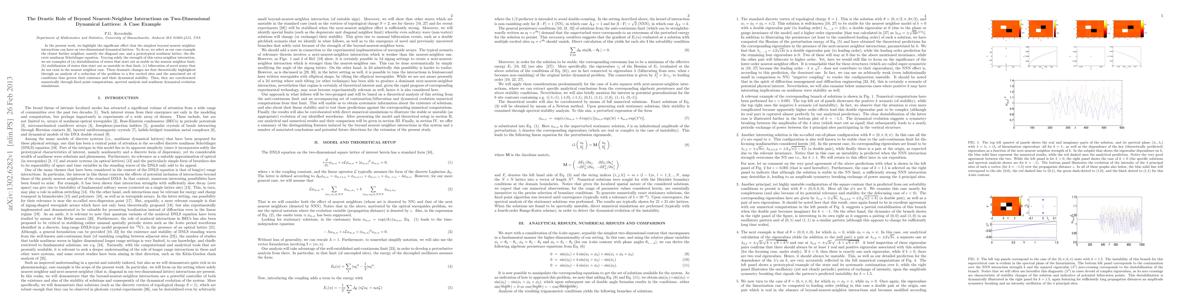 In the present work, we highlight the significant effect that the simplest beyond nearest neighbor interactions can have on two-dimensional dynamical lattices. To do so, we select as our case example the closest further neighbor, namely the diagonal one, and a prototypical nonlinear lattice, the discrete nonlinear Schrodinger equation. Varying solely the strength of this extra neighbor interaction, we see examples of (a) destabilization of states that start out as stable in the nearest neighbor limit; (b) stabilization of states that start out as unstable in that limit; (c) bifurcation of novel states that do not exist in the nearest neighbor case. These dramatic changes are first theoretically highlighted through an analysis of a reduction of the problem to a few excited sites and the associated set of conditions that govern their existence and their dynamical stability. Then, they are corroborated numerically through fixed point computations, spectral analysis and nonlinear dynamical evolution simulations.