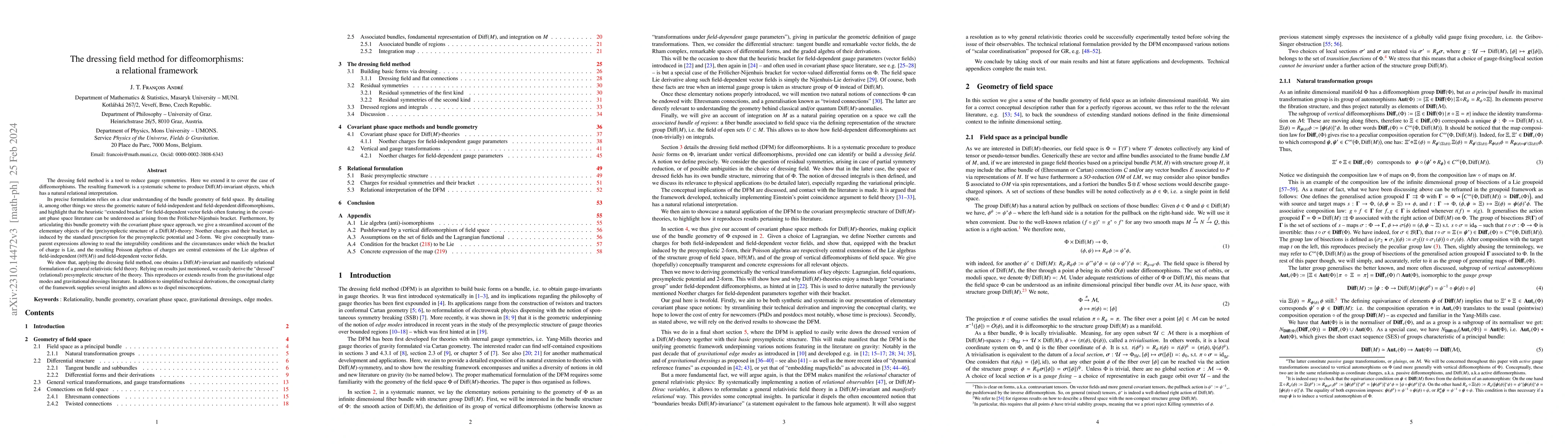 The dressing field method is a tool to reduce gauge symmetries. Here we extend it to cover the case of diffeomorphisms. The resulting framework is a systematic scheme to produce Diff(M)-invariant objects, which has a natural relational interpretation. Its precise formulation relies on a clear understanding of the bundle geometry of field space. By detailing it, among other things we stress the geometric nature of field-independent and field-dependent diffeomorphisms, and highlight that the heuristic "extended bracket" for field-dependent vector fields often featuring in the covariant phase space literature can be understood as arising from the Fr\"olicher-Nijenhuis bracket. Furthermore, by articulating this bundle geometry with the covariant phase space approach, we give a streamlined account of the elementary objects of the (pre)symplectic structure of a Diff(M)-theory: Noether charges and their bracket, as induced by the standard prescription for the presymplectic potential and 2-form. We give conceptually transparent expressions allowing to read the integrability conditions and the circumstances under which the bracket of charge is Lie, and the resulting Poisson algebras of charges are central extensions of the Lie algebras of field-independent ($\mathfrak{diff}(M)$) and field-dependent vector fields. We show that, applying the dressing field method, one obtains a Diff(M)-invariant and manifestly relational formulation of a general relativistic field theory. Relying on results just mentioned, we easily derive the "dressed" (relational) presymplectic structure of the theory. This reproduces or extends results from the gravitational edge mode and gravitational dressing literature. In addition to simplified technical derivations, the conceptual clarity of the framework supplies several insights and allows us to dispel misconceptions.