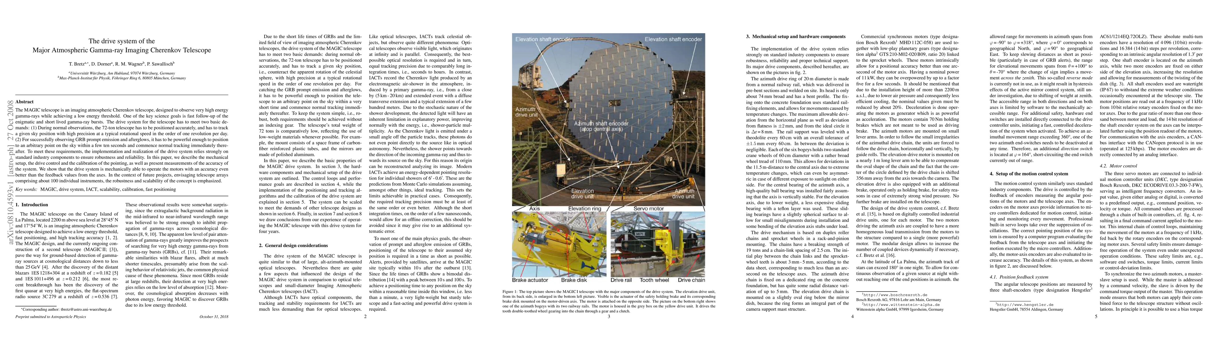 The MAGIC telescope's drive system, utilizing standard industrial components, ensures precise positioning and tracking for gamma-ray observations. It meets demanding requirements for gamma-ray burst follow-ups, demonstrating high accuracy and robustness, which is crucial for future large-scale telescope arrays.