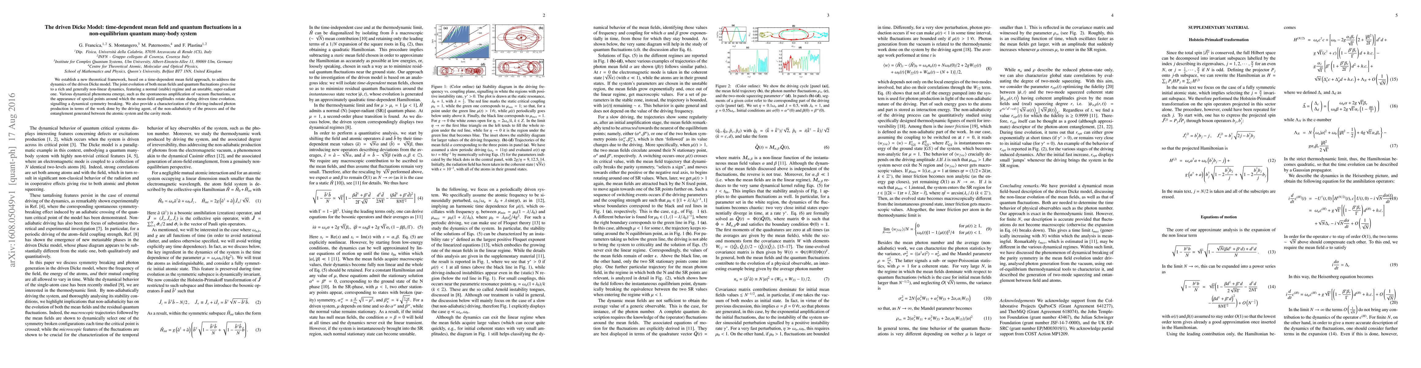 We establish a new theoretical framework, based on a time-dependent mean field approach, to address the dynamics of the driven Dicke model. The joint evolution of both mean fields and quantum fluctuations gives rise to a rich and generally non-linear dynamics, featuring a normal (stable) regime and an unstable, super-radiant one. Various dynamical phenomena emerge, such as the spontaneous amplification of vacuum fluctuations, or the appearance of special points around which the mean-field amplitudes rotate during driven time evolution, signalling a dynamical symmetry breaking. We also provide a characterization of the driving-induced photon production in terms of the work done by the driving agent, of the non-adiabaticity of the process and of the entanglement generated between the atomic system and the cavity mode.