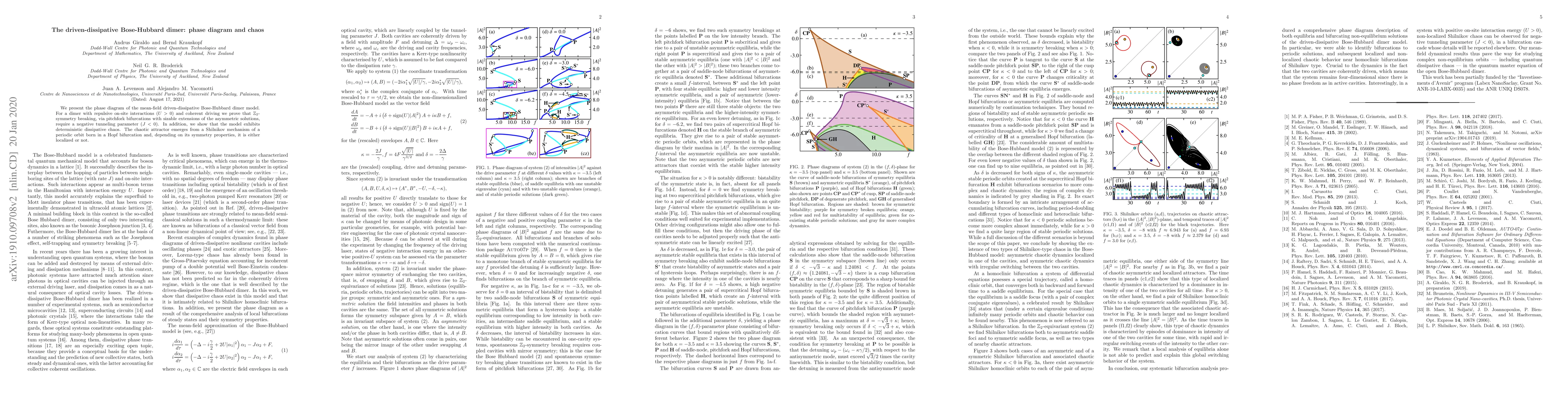 The research presents the phase diagram of a driven-dissipative Bose-Hubbard dimer model, revealing $\mathbb{Z}_2$-symmetry breaking and chaotic behavior arising from a Shilnikov mechanism, with asymmetric solutions extending via pitchfork bifurcations when tunneling is negative.