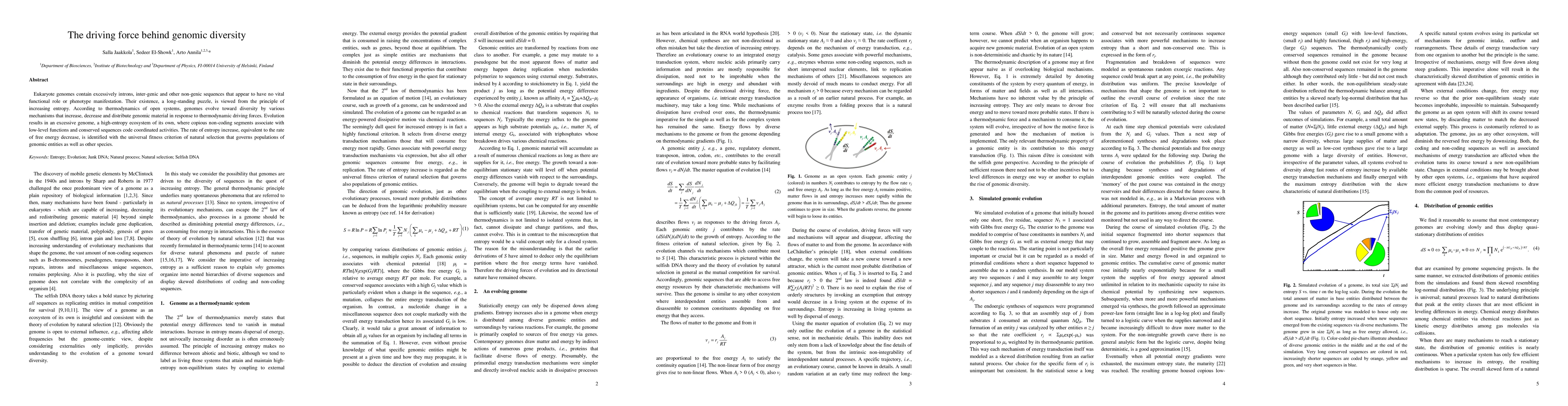 Eukaryote genomes contain excessively introns, inter-genic and other non-genic sequences that appear to have no vital functional role or phenotype manifestation. Their existence, a long-standing puzzle, is viewed from the principle of increasing entropy. According to thermodynamics of open systems, genomes evolve toward diversity by various mechanisms that increase, decrease and distribute genomic material in response to thermodynamic driving forces. Evolution results in an excessive genome, a high-entropy ecosystem of its own, where copious non-coding segments associate with low-level functions and conserved sequences code coordinated activities. The rate of entropy increase, equivalent to the rate of free energy decrease, is identified with the universal fitness criterion of natural selection that governs populations of genomic entities as well as other species.