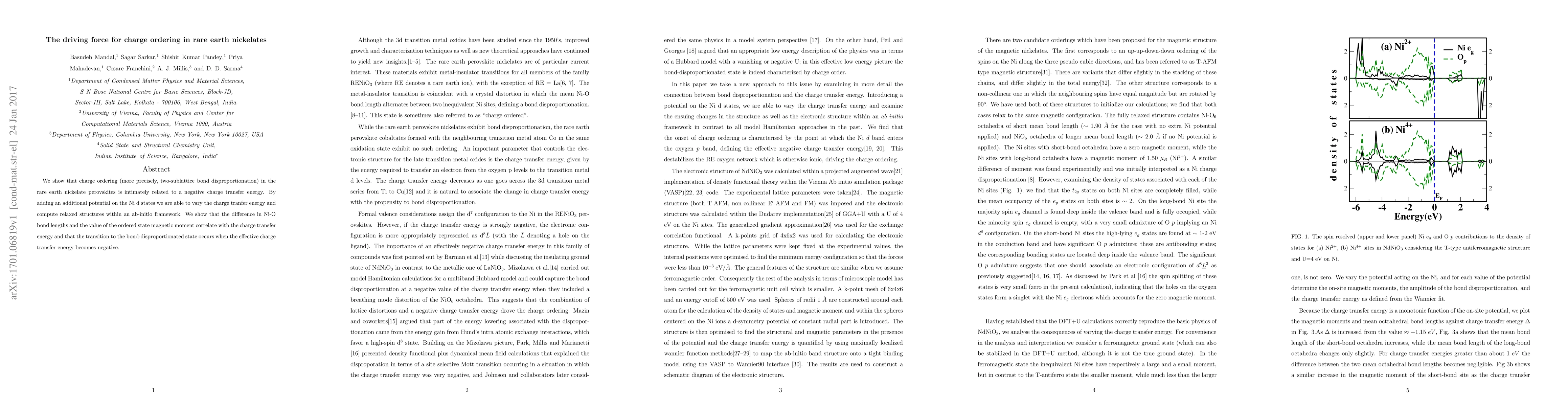 We show that charge ordering (more precisely, two-sublattice bond disproportionation) in the rare earth nickelate perovskites is intimately related to a negative charge transfer energy. By adding an additional potential on the Ni d states we are able to vary the charge tranfer energy and compute relaxed structures within an ab-initio framework. We show that the difference in Ni-O bond lengths and the value of the ordered state magnetic moment correlate with the charge transfer energy and that the transition to the bond-disproportionated state occurs when the effective charge transfer energy becomes negative.
