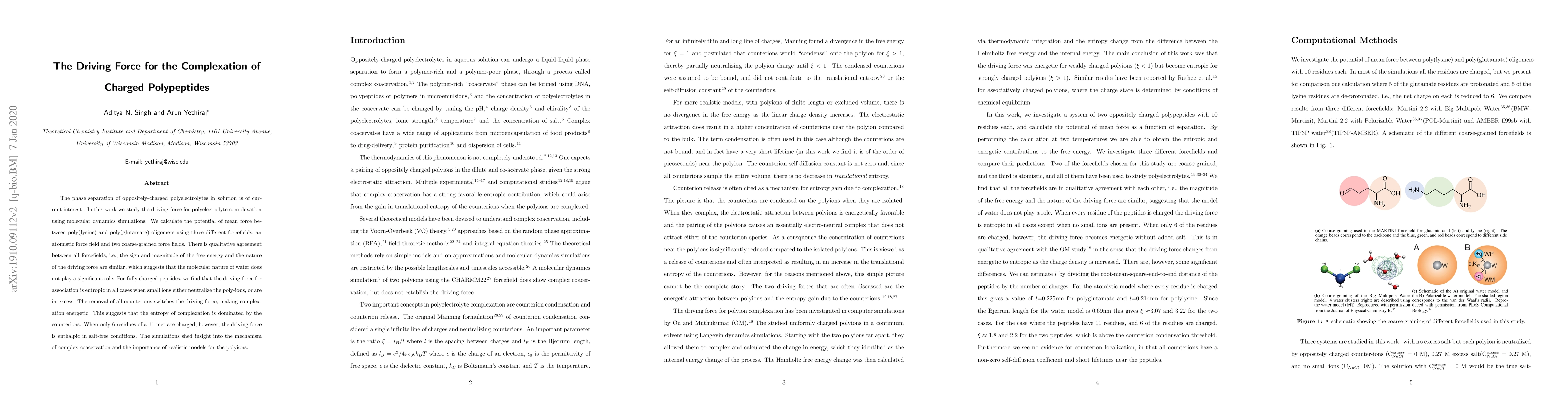 This research investigates the driving force for complexation between oppositely-charged polypeptides using molecular dynamics simulations. It finds that for fully charged peptides, the association is primarily entropic due to counterion behavior, while partial charge reduces this to an enthalpic effect in salt-free conditions.