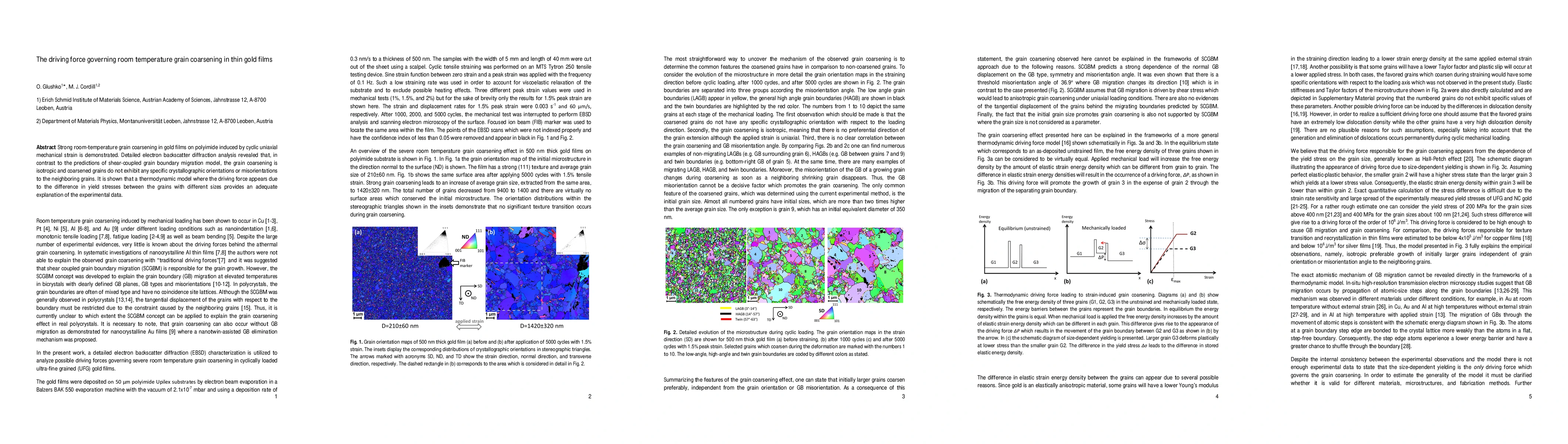 Strong room-temperature grain coarsening in gold films on polyimide induced by cyclic uniaxial mechanical strain is demonstrated. Detailed electron backscatter diffraction analysis revealed that, in contrast to the predictions of shear-coupled grain boundary migration model, the grain coarsening is isotropic and coarsened grains do not exhibit any specific crystallographic orientations or misorientations to the neighboring grains. It is shown that a thermodynamic model where the driving force appears due to the difference in yield stresses between the grains with different sizes provides an adequate explanation of the experimental data.