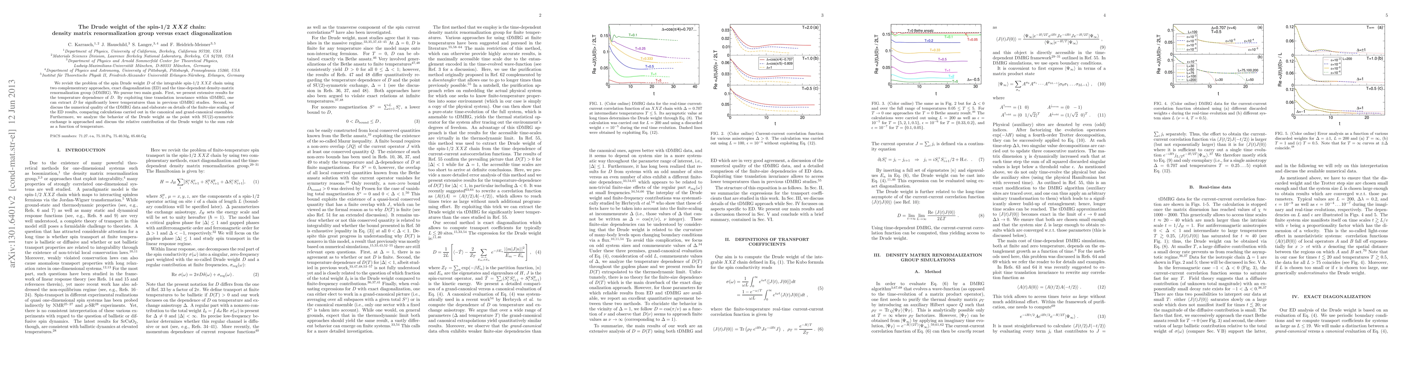 This paper compares the spin Drude weight D of the spin-1/2 XXZ chain using exact diagonalization and time-dependent density-matrix renormalization group methods, focusing on temperature dependence and numerical accuracy. It also examines the Drude weight's behavior near the SU(2)-symmetric exchange point and its contribution to the sum rule.