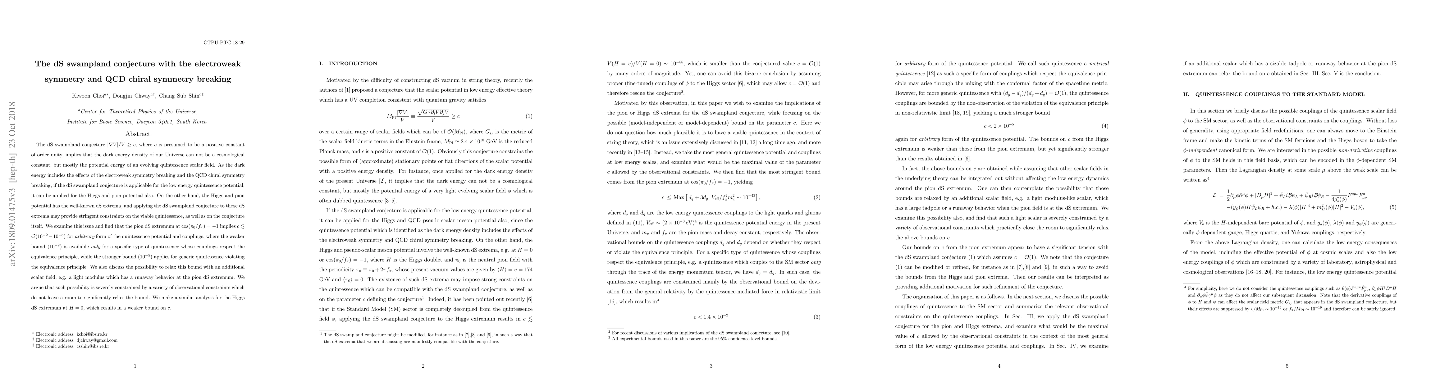 The dS swampland conjecture $|\nabla V|/V \geq c$, where $c$ is presumed to be a positive constant of order unity, implies that the dark energy density of our Universe can not be a cosmological constant, but mostly the potential energy of an evolving quintessence scalar field. As the dark energy includes the effects of the electroweak symmetry breaking and the QCD chiral symmetry breaking, if the dS swampland conjecture is applicable for the low energy quintessence potential, it can be applied for the Higgs and pion potential also. On the other hand, the Higgs and pion potential has the well-known dS extrema, and applying the dS swampland conjecture to those dS extrema may provide stringent constraints on the viable quintessence, as well as on the conjecture itself. We examine this issue and find that the pion dS extremum at $\cos(\pi_0/f_\pi)=-1$ implies $c\lesssim {\cal O}(10^{-2}-10^{-5})$ for $arbitrary$ form of the quintessence potential and couplings, where the weaker bound ($10^{-2}$) is available $only$ for a specific type of quintessence whose couplings respect the equivalence principle, while the stronger bound ($10^{-5}$) applies for generic quintessence violating the equivalence principle. We also discuss the possibility to relax this bound with an additional scalar field, e.g. a light modulus which has a runaway behavior at the pion dS extremum. We argue that such possibility is severely constrained by a variety of observational constraints which do not leave a room to significantly relax the bound. We make a similar analysis for the Higgs dS extremum at $H=0$, which results in a weaker bound on $c$.