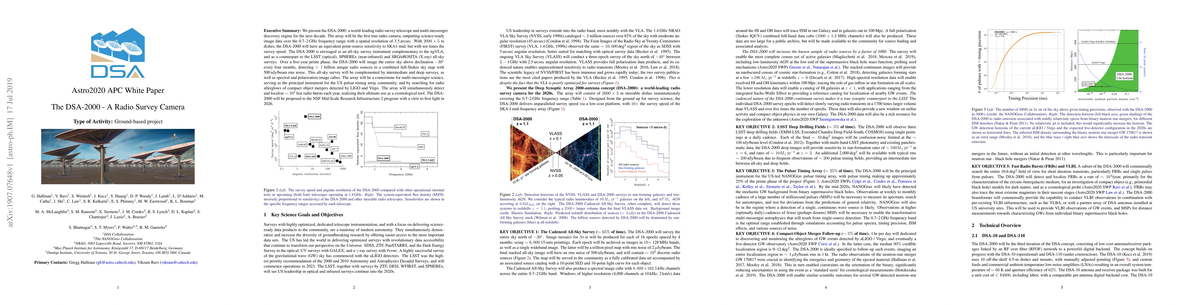We present the DSA-2000: a world-leading radio survey telescope and multi-messenger discovery engine for the next decade. The array will be the first true radio camera, outputting science-ready image data over the 0.7 - 2 GHz frequency range with a spatial resolution of 3.5 arcsec. With 2000 x 5 m dishes, the DSA-2000 will have an equivalent point-source sensitivity to SKA1-mid, but with ten times the survey speed. The DSA-2000 is envisaged as an all-sky survey instrument complementary to the ngVLA, and as a counterpart to the LSST (optical), SPHEREx (near-infrared) and SRG/eROSITA (X-ray) all-sky surveys. Over a five-year prime phase, the DSA-2000 will image the entire sky above declination -30 degrees every four months, detecting > 1 unique billion radio sources in a combined full-Stokes sky map with 500 nJy/beam rms noise. This all-sky survey will be complemented by intermediate and deep surveys, as well as spectral and polarization image cubes. The array will be a cornerstone for multi-messenger science, serving as the principal instrument for the US pulsar timing array community, and by searching for radio afterglows of compact object mergers detected by LIGO and Virgo. The array will simultaneously detect and localize ~10,000 fast radio bursts each year, realizing their ultimate use as a cosmological tool. The DSA-2000 will be proposed to the NSF Mid-Scale Research Infrastructure-2 program with a view to first light in 2026