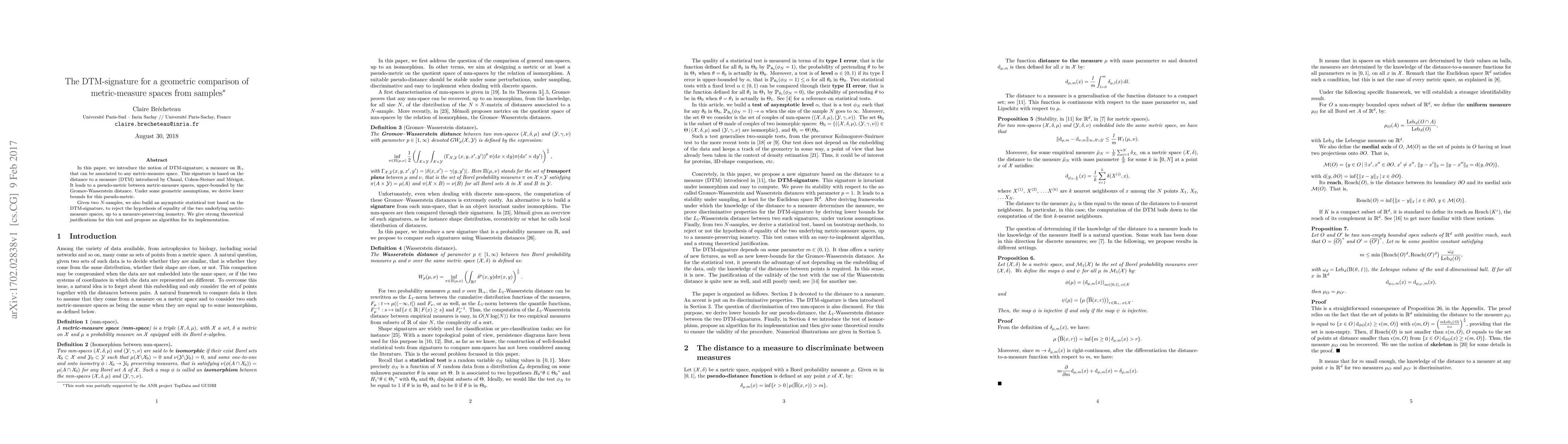 This paper introduces the DTM-signature, a measure for comparing metric-measure spaces based on the distance to a measure. It provides a pseudo-metric upper-bounded by the Gromov-Wasserstein distance and an asymptotic statistical test for determining if two sampled metric-measure spaces are equivalent, supported by strong theoretical justifications.
