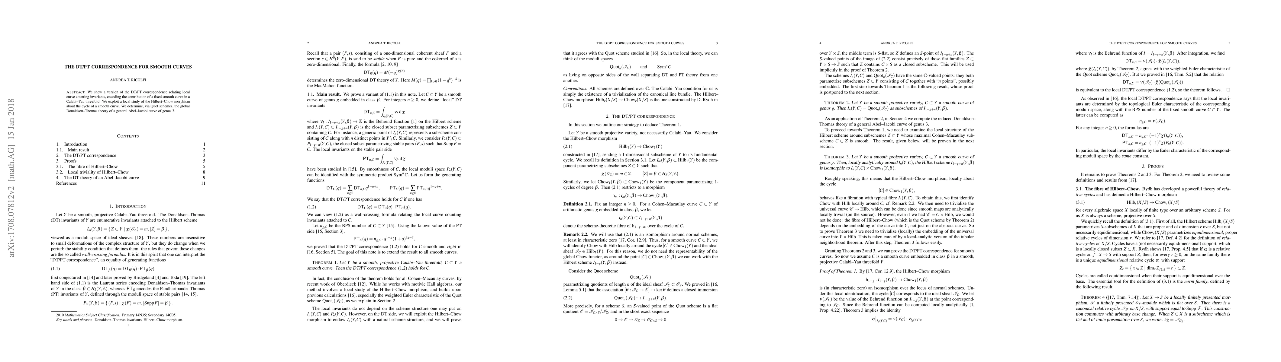 This paper establishes a DT/PT correspondence for smooth curves in Calabi-Yau threefolds, utilizing a local analysis of the Hilbert-Chow morphism and Quot schemes to compute global Donaldson-Thomas invariants for Abel-Jacobi curves of genus 3.