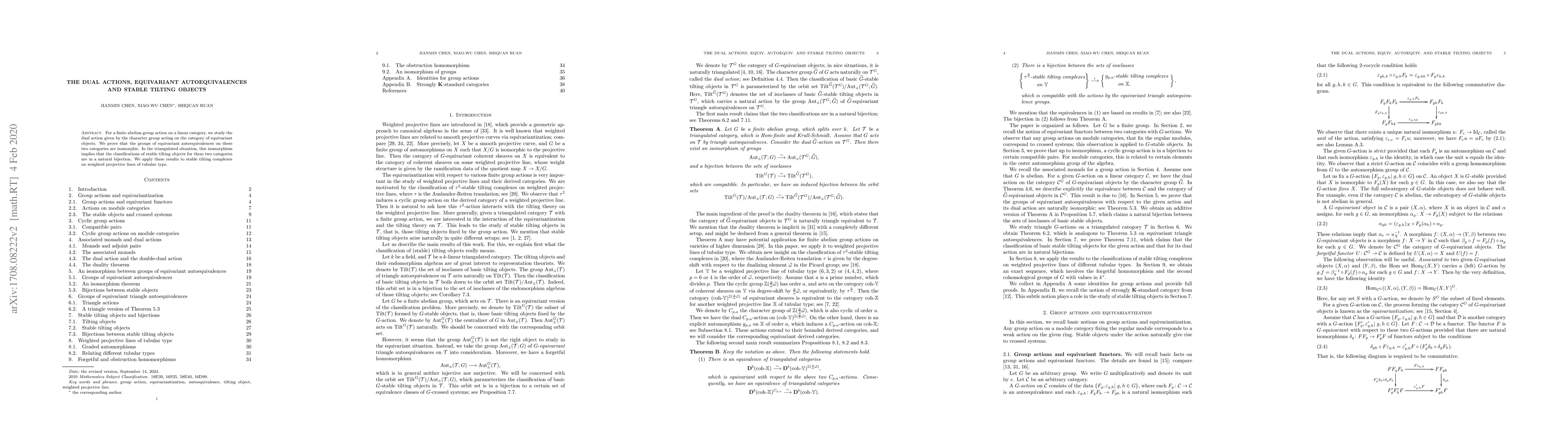 This paper investigates the dual action of a finite abelian group on a linear category and proves that the groups of equivariant autoequivalences for the original and dual categories are isomorphic. It concludes by showing that this isomorphism leads to a natural bijection between the classifications of stable tilting objects in these categories, with applications to stable tilting complexes on tubular type weighted projective lines.