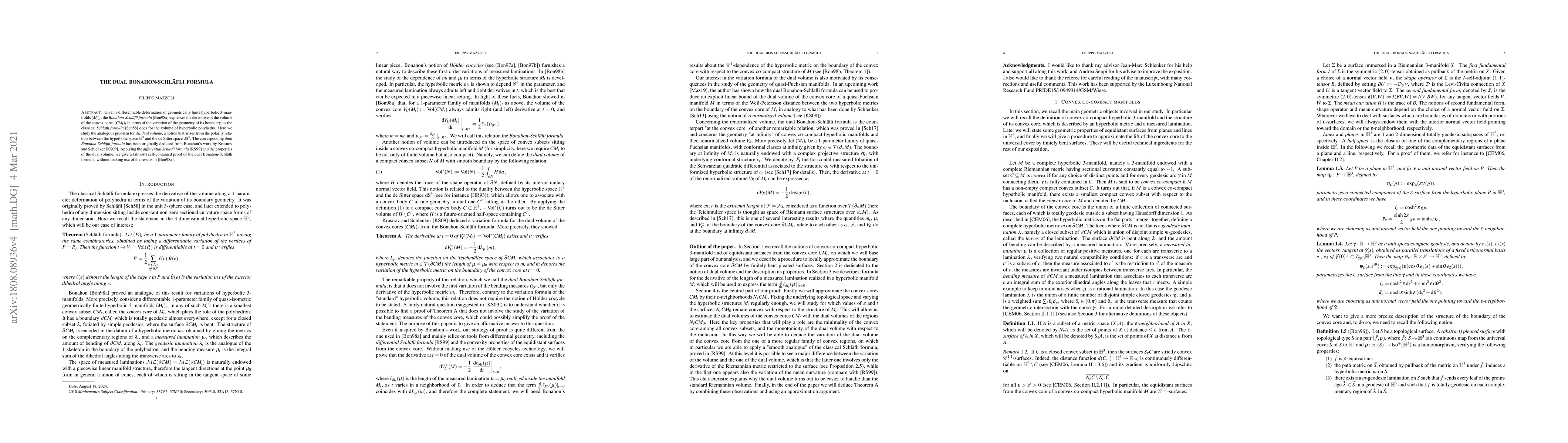 Given a differentiable deformation of geometrically finite hyperbolic $3$-manifolds $(M_t)_t$, the Bonahon-Schl\"afli formula expresses the derivative of the volume of the convex cores $(C M_t)_t$ in terms of the variation of the geometry of its boundary, as the classical Schl\"afli formula does for the volume of hyperbolic polyhedra. Here we study the analogous problem for the dual volume, a notion that arises from the polarity relation between the hyperbolic space $\mathbb{H}^3$ and the de Sitter space $\mathrm{dS}^3$. The corresponding dual Bonahon-Schl\"afli formula has been originally deduced from Bonahon's work by Krasnov and Schlenker. Here, making use of the differential Schl\"afli formula and the properties of the dual volume, we give a (almost) self-contained proof of the dual Bonahon-Schl\"afli formula, without making use of Bonahon's original result.