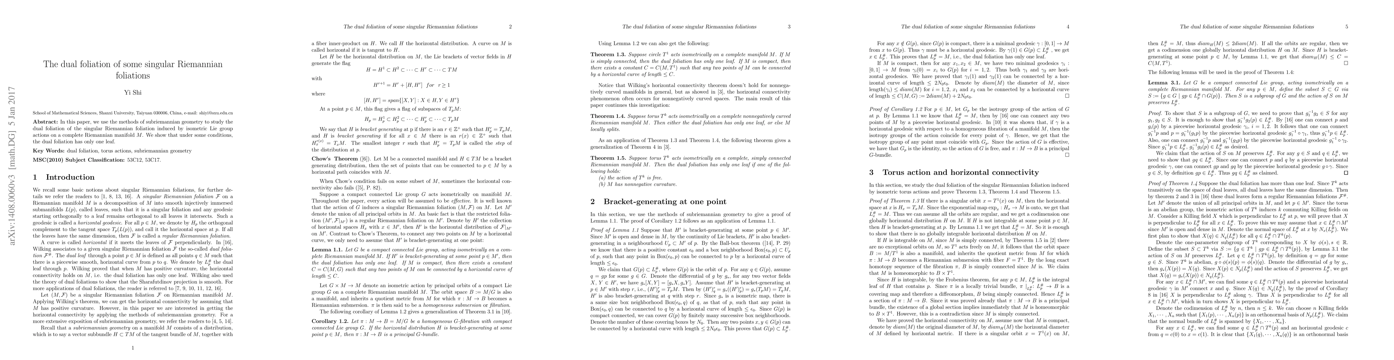 Summary: This paper employs subriemannian geometry techniques to investigate the dual foliation of singular Riemannian foliations arising from isometric Lie group actions on a complete Riemannian manifold. It demonstrates that under certain conditions, the dual foliation consists of a single leaf.