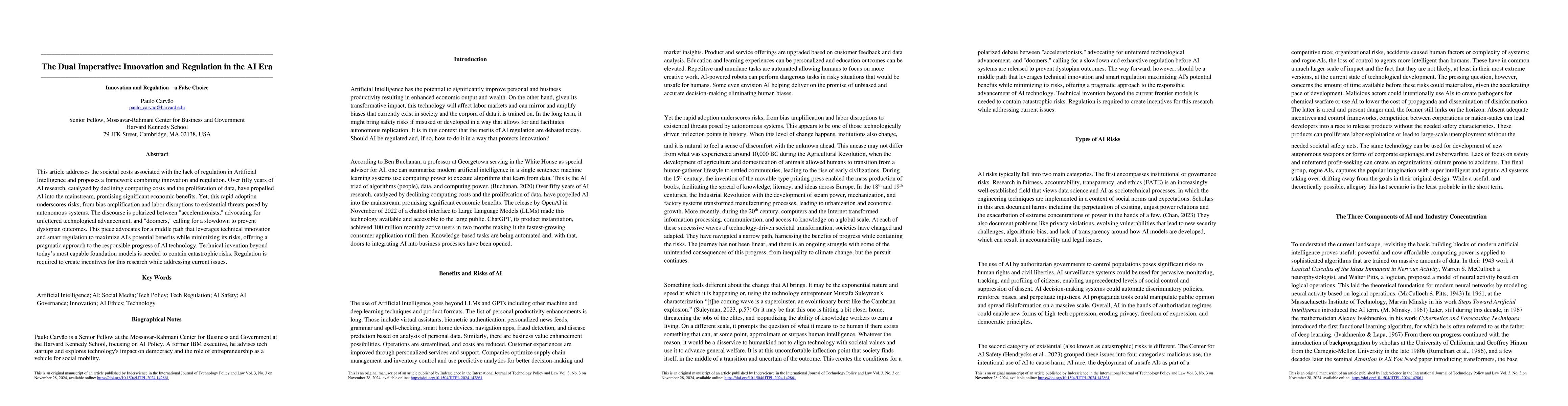 This paper explores the balance between innovation and regulation in AI, highlighting the risks of unregulated rapid advancement and proposing a balanced framework that maximizes AI's benefits while minimizing its societal risks through technical innovation and informed regulation.