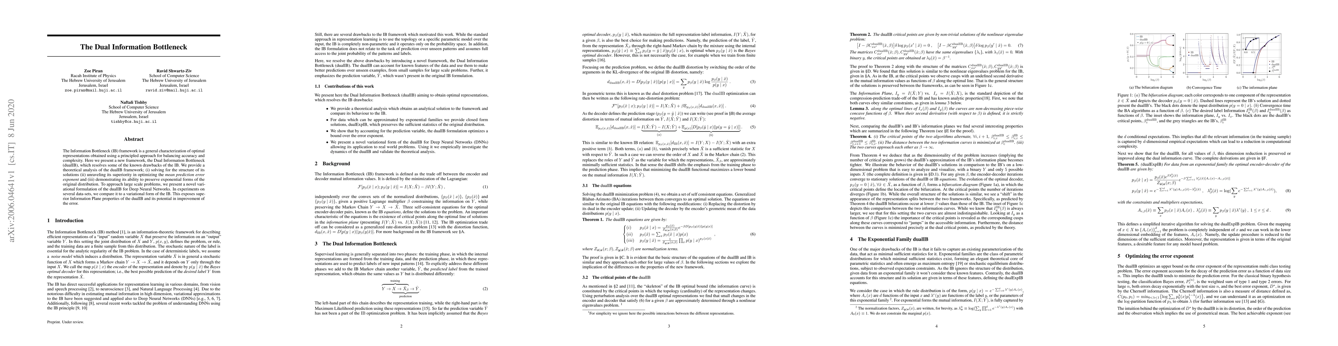The Information Bottleneck (IB) framework is a general characterization of optimal representations obtained using a principled approach for balancing accuracy and complexity. Here we present a new framework, the Dual Information Bottleneck (dualIB), which resolves some of the known drawbacks of the IB. We provide a theoretical analysis of the dualIB framework; (i) solving for the structure of its solutions (ii) unraveling its superiority in optimizing the mean prediction error exponent and (iii) demonstrating its ability to preserve exponential forms of the original distribution. To approach large scale problems, we present a novel variational formulation of the dualIB for Deep Neural Networks. In experiments on several data-sets, we compare it to a variational form of the IB. This exposes superior Information Plane properties of the dualIB and its potential in improvement of the error.