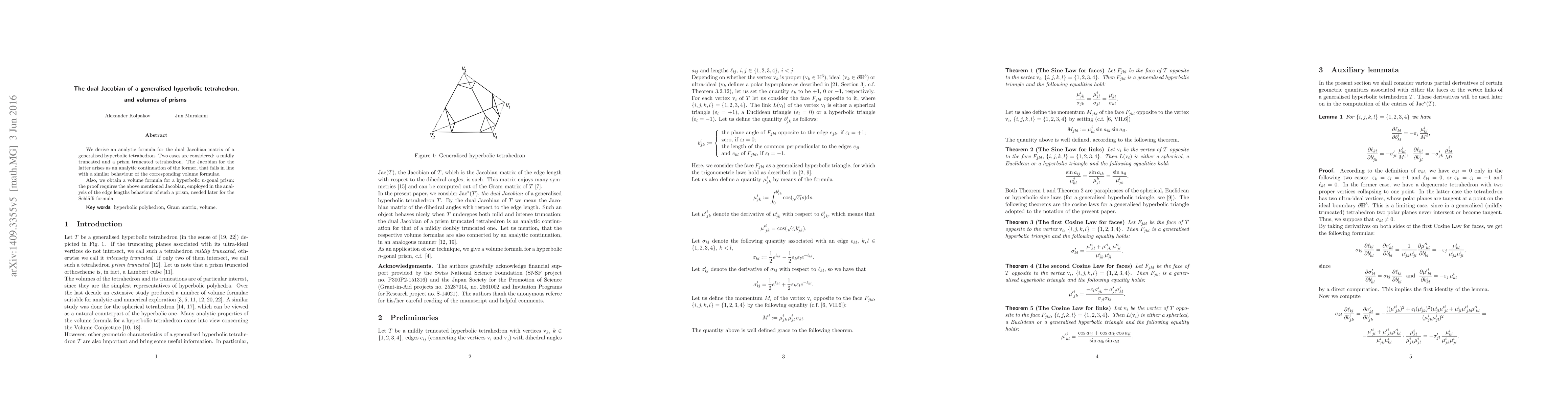 We derive an analytic formula for the dual Jacobian matrix of a generalised hyperbolic tetrahedron. Two cases are considered: a mildly truncated and a prism truncated tetrahedron. The Jacobian for the latter arises as an analytic continuation of the former, that falls in line with a similar behaviour of the corresponding volume formulae. Also, we obtain a volume formula for a hyperbolic $n$-gonal prism: the proof requires the above mentioned Jacobian, employed in the analysis of the edge lengths behaviour of such a prism, needed later for the Schl\"afli formula.