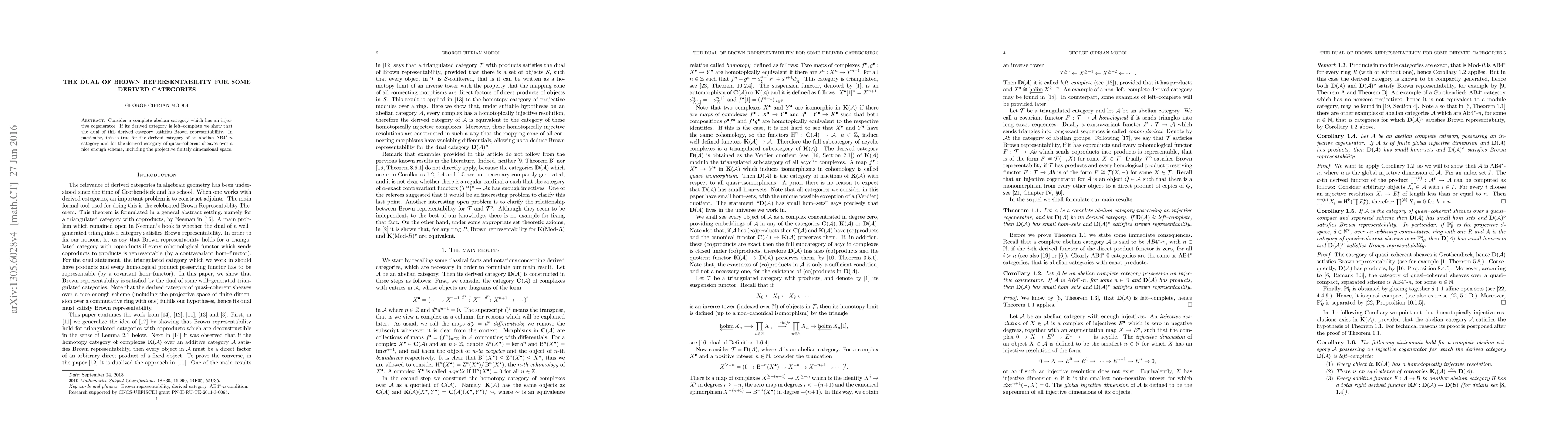 Consider a complete abelian category which has an injective cogenerator. If its derived category is left--complete we show that the dual of this derived category satisfies Brown representability. In particular this is true for the derived category of an abelian AB$4^*$-$n$ category, for the derived category of quasi--coherent sheaves over a nice enough scheme (including the projective finitely dimensional space) and for the full subcategory of derived category of all sheaves over an algebraic stack consisting from complexes with quasi--coherent cohomology.