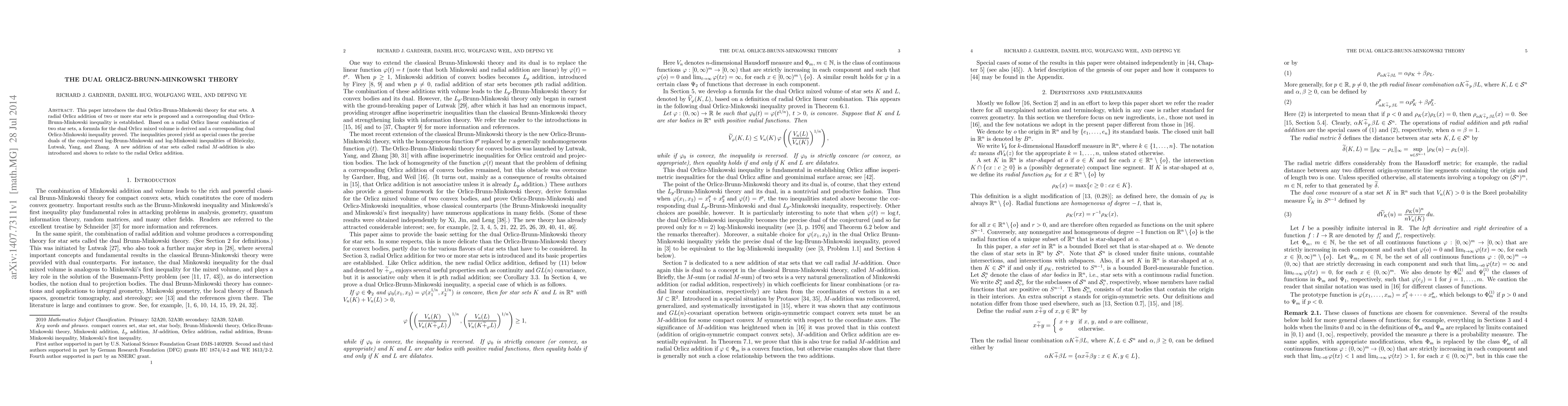 The paper develops the dual Orlicz-Brunn-Minkowski theory for star sets, introducing radial Orlicz addition and establishing a dual Orlicz-Brunn-Minkowski inequality, along with a formula for the dual Orlicz mixed volume. It also introduces a new radial $M$-addition and demonstrates its relationship to the radial Orlicz addition.