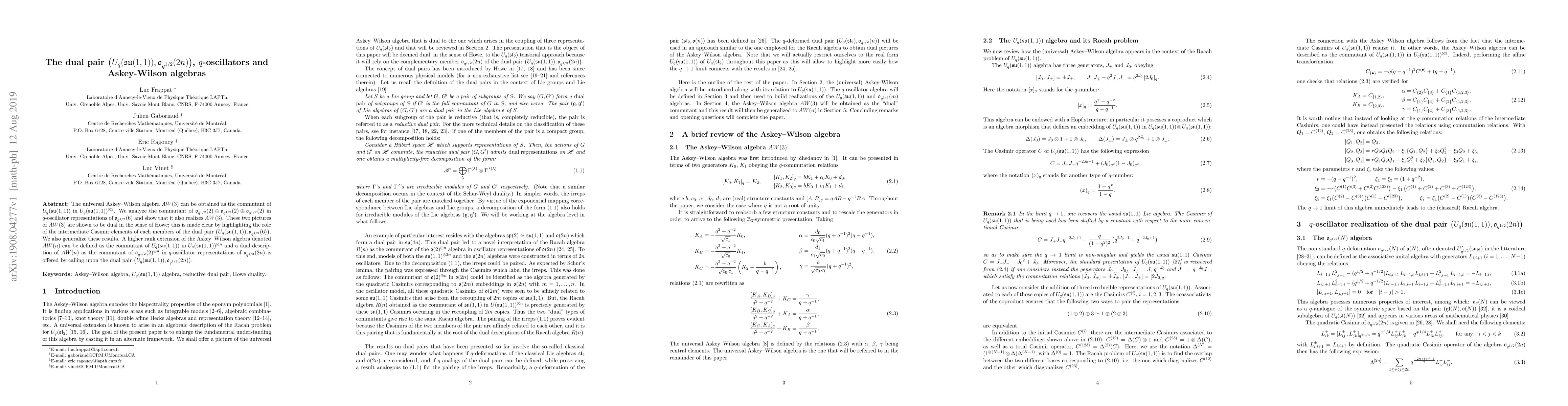 The universal Askey-Wilson algebra $AW(3)$ can be obtained as the commutant of $U_q(\mathfrak{su}(1,1))$ in $U_q(\mathfrak{su}(1,1))^{\otimes3}$. We analyze the commutant of $\mathfrak{o}_{q^{1/2}}(2)\oplus\mathfrak{o}_{q^{1/2}}(2)\oplus\mathfrak{o}_{q^{1/2}}(2)$ in $q$-oscillator representations of $\mathfrak{o}_{q^{1/2}}(6)$ and show that it also realizes $AW(3)$. These two pictures of $AW(3)$ are shown to be dual in the sense of Howe; this is made clear by highlighting the role of the intermediate Casimir elements of each members of the dual pair $\big(U_q(\mathfrak{su}(1,1)),\mathfrak{o}_{q^{1/2}}(6)\big)$. We also generalize these results. A higher rank extension of the Askey-Wilson algebra denoted $AW(n)$ can be defined as the commutant of $U_q(\mathfrak{su}(1,1))$ in $U_q(\mathfrak{su}(1,1))^{\otimes n}$ and a dual description of $AW(n)$ as the commutant of $\mathfrak{o}_{q^{1/2}}(2)^{\oplus n}$ in $q$-oscillator representations of $\mathfrak{o}_{q^{1/2}}(2n)$ is offered by calling upon the dual pair $\big(U_q(\mathfrak{su}(1,1)),\mathfrak{o}_{q^{1/2}}(2n)\big)$.