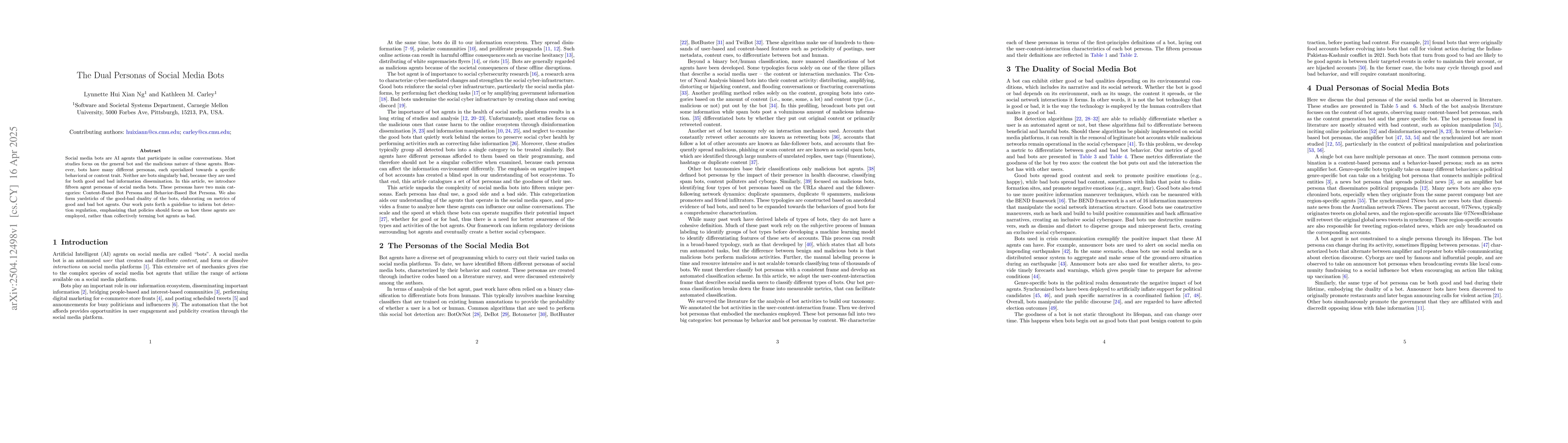 The paper presents a detailed taxonomy of social media bots, categorizing them into Content-Based and Behavior-Based personas, along with metrics to assess their 'good' vs 'bad' duality.