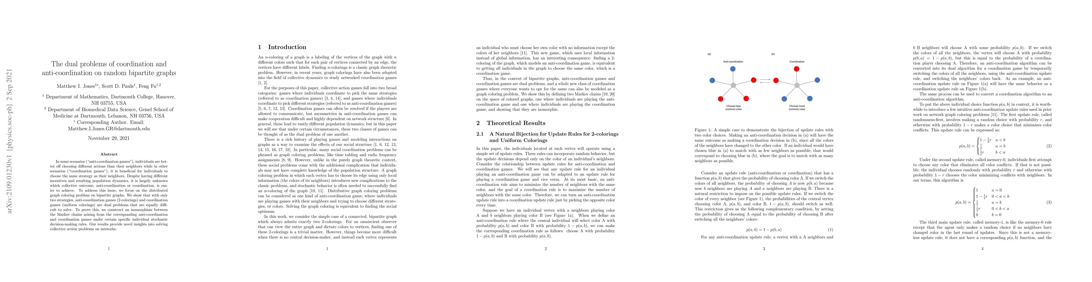 In some scenarios ("anti-coordination games"), individuals are better off choosing different actions than their neighbors while in other scenarios ("coordination games"), it is beneficial for individuals to choose the same strategy as their neighbors. Despite having different incentives and resulting population dynamics, it is largely unknown which collective outcome, anti-coordination or coordination, is easier to achieve. To address this issue, we focus on the distributed graph coloring problem on bipartite graphs. We show that with only two strategies, anti-coordination games (2-colorings) and coordination games (uniform colorings) are dual problems that are equally difficult to solve. To prove this, we construct an isomorphism between the Markov chains arising from the corresponding anti-coordination and coordination games under certain specific individual stochastic decision-making rules. Our results provide novel insights into solving collective action problems on networks.