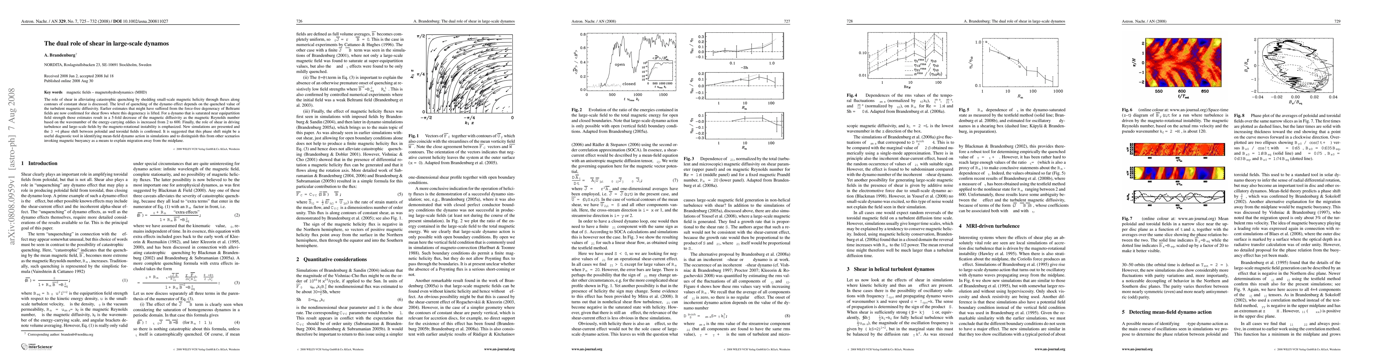 The role of shear in alleviating catastrophic quenching by shedding small-scale magnetic helicity through fluxes along contours of constant shear is discussed. The level of quenching of the dynamo effect depends on the quenched value of the turbulent magnetic diffusivity. Earlier estimates that might have suffered from the force-free degeneracy of Beltrami fields are now confirmed for shear flows where this degeneracy is lifted. For a dynamo that is saturated near equipartition field strength those estimates result in a 5-fold decrease of the magnetic diffusivity as the magnetic Reynolds number based on the wavenumber of the energy-carrying eddies is increased from 2 to 600. Finally, the role of shear in driving turbulence and large-scale fields by the magneto-rotational instability is emphasized. New simulations are presented and the 3pi/4 phase shift between poloidal and toroidal fields is confirmed. It is suggested that this phase shift might be a useful diagnostic tool in identifying mean-field dynamo action in simulations and to distinguish this from other scenarios invoking magnetic buoyancy as a means to explain migration away from the midplane.