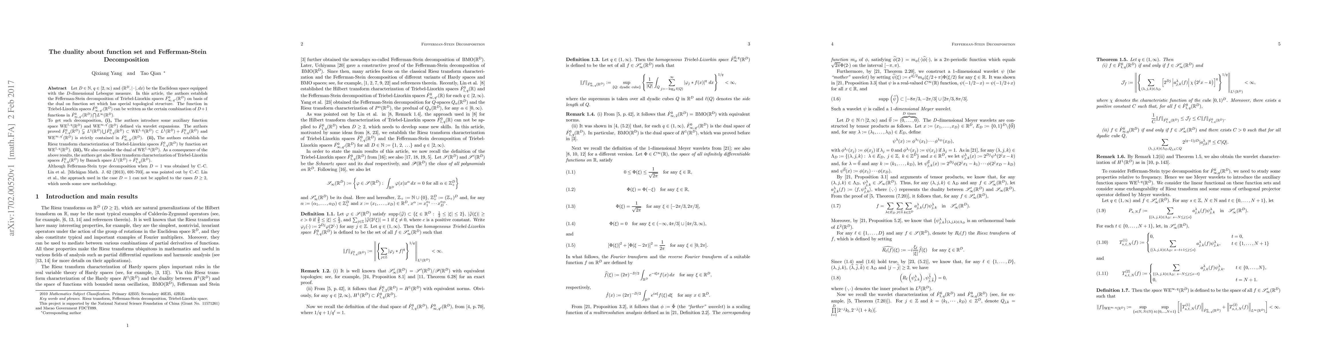 Let $D\in\mathbb{N}$, $q\in[2,\infty)$ and $(\mathbb{R}^D,|\cdot|,dx)$ be the Euclidean space equipped with the $D$-dimensional Lebesgue measure. In this article, the authors establish the Fefferman-Stein decomposition of Triebel-Lizorkin spaces $\dot{F}^0_{\infty,\,q'}(\mathbb{R}^D)$ on basis of the dual on function set which has special topological structure. The function in Triebel-Lizorkin spaces $\dot{F}^0_{\infty,\,q'}(\mathbb{R}^D)$ can be written as the certain combination of $D+1$ functions in $\dot{F}^0_{\infty,\,q'}(\mathbb{R}^D) \bigcap L^{\infty}(\mathbb{R}^D)$. To get such decomposition, {\bf (i),} The authors introduce some auxiliary function space $\mathrm{WE}^{1,\,q}(\mathbb R^D)$ and $\mathrm{WE}^{\infty,\,q'}(\mathbb{R}^D)$ defined via wavelet expansions. The authors proved $\dot{F}^{0}_{1,q} \subsetneqq L^{1} \bigcup \dot{F}^{0}_{1,q}\subset {\rm WE}^{1,\,q}\subset L^{1} + \dot{F}^{0}_{1,q}$ and $\mathrm{WE}^{\infty,\,q'}(\mathbb{R}^D)$ is strictly contained in $\dot{F}^0_{\infty,\,q'}(\mathbb{R}^D)$. {\bf (ii),} The authors establish the Riesz transform characterization of Triebel-Lizorkin spaces $\dot{F}^0_{1,\,q}(\mathbb{R}^D)$ by function set $\mathrm{WE}^{1,\,q}(\mathbb R^D)$. {\bf (iii),} We also consider the dual of $\mathrm{WE}^{1,\,q}(\mathbb R^D)$. As a consequence of the above results, the authors get also Riesz transform characterization of Triebel-Lizorkin spaces $\dot{F}^0_{1,\,q}(\mathbb{R}^D)$ by Banach space $L^{1} + \dot{F}^{0}_{1,q}$. Although Fefferman-Stein type decomposition when $D=1$ was obtained by C.-C. Lin et al. [Michigan Math. J. 62 (2013), 691-703], as was pointed out by C.-C. Lin et al., the approach used in the case $D=1$ can not be applied to the cases $D\ge2$, which needs some new methodology.