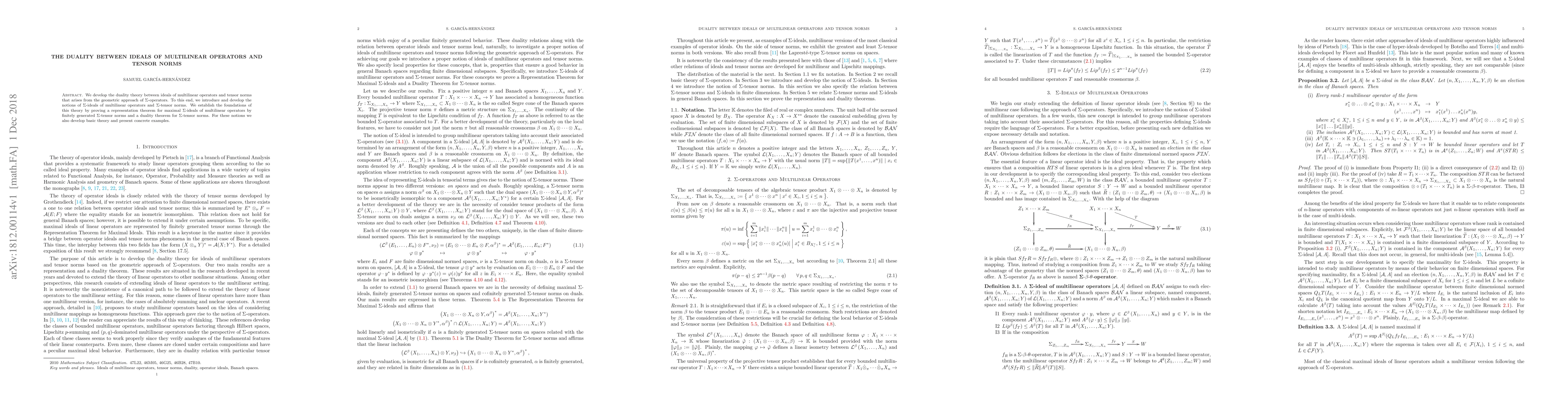 This paper develops a duality theory between ideals of multilinear operators and tensor norms, introducing $\Sigma$-ideals and $\Sigma$-tensor norms. It establishes foundational theorems, including a representation theorem for maximal $\Sigma$-ideals and a duality theorem for $\Sigma$-tensor norms, along with basic theory and examples.