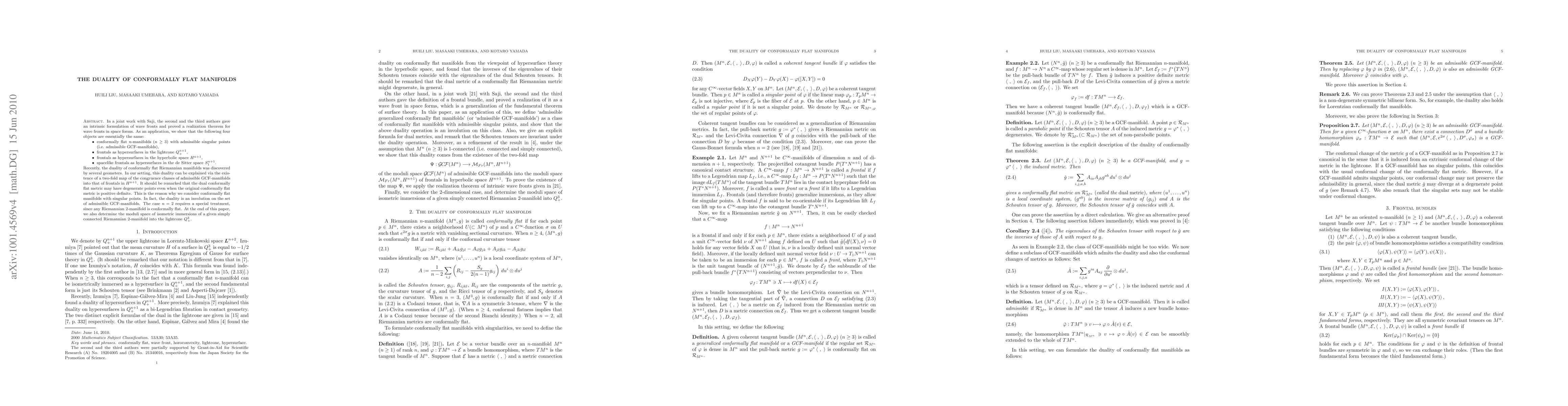This paper explores the intrinsic formulation of wave fronts and proves their realization in space forms, demonstrating that conformally flat n-manifolds with admissible singular points (GCF-manifolds) are essentially equivalent to frontals in various geometric settings. It establishes a duality between conformally flat Riemannian manifolds, noting that the dual metric may be degenerate, and determines the moduli space of isometric immersions for 2-manifolds into the lightcone.