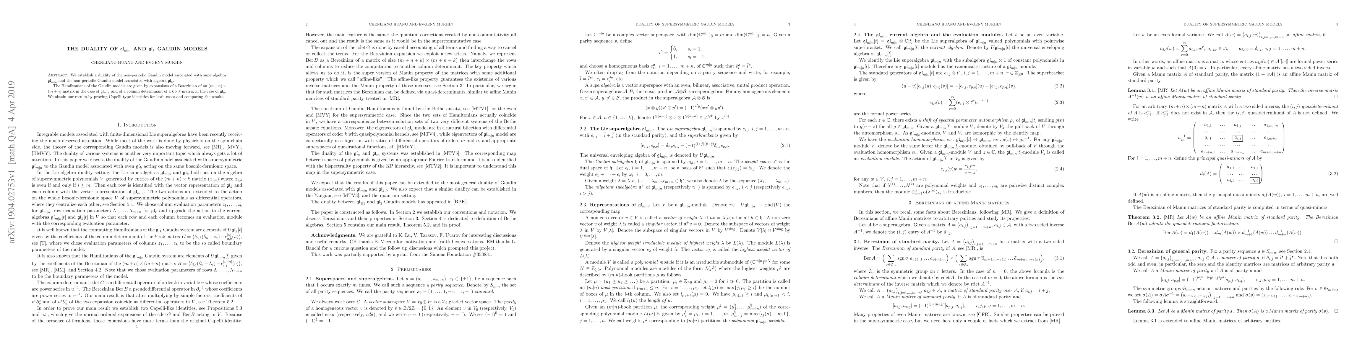 This paper establishes a duality between the non-periodic Gaudin models associated with superalgebra $\mathfrak{gl}_{m|n}$ and algebra $\mathfrak{gl}_k$. The authors achieve this by proving Capelli type identities for both models and comparing their Hamiltonians derived from Berezinians and column determinants.