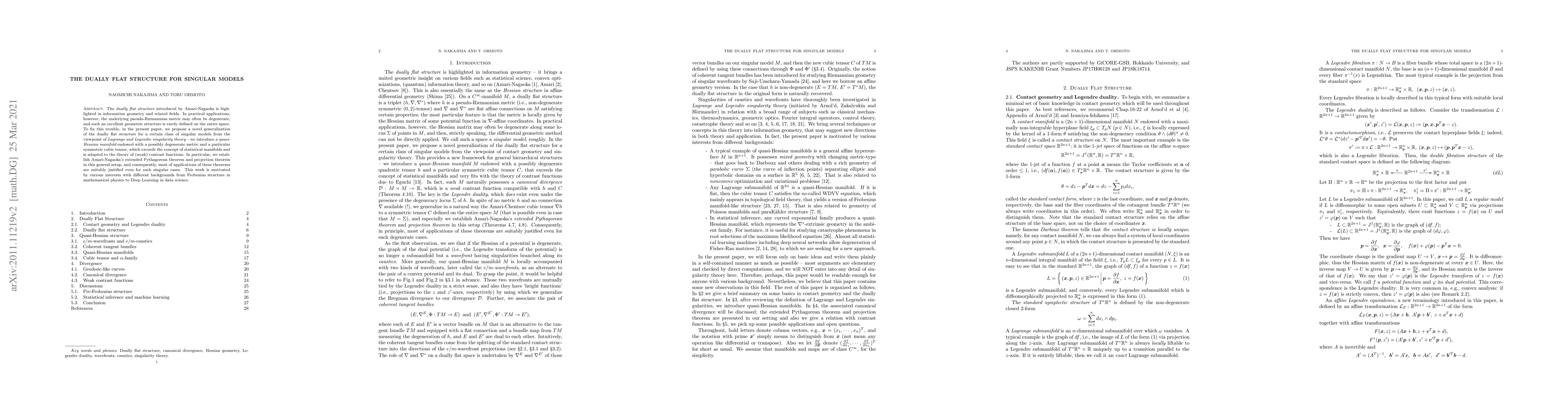 This paper generalizes the dually flat structure for singular models using quasi-Hessian manifolds and a degenerate metric, extending Amari-Nagaoka's theorems to accommodate degenerate pseudo-Riemannian metrics. The approach is motivated by applications in mathematical physics and data science.