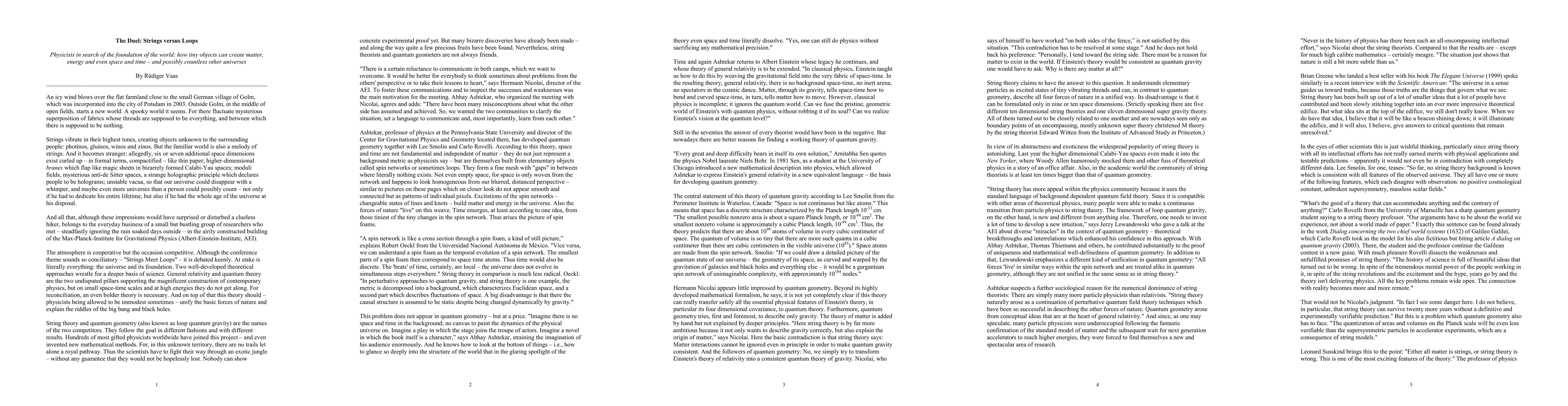 Physicists in search of the foundation of the world: how tiny objects can create matter, energy and even space and time - and possibly countless other universes. -- This article is meant as an introduction into quantum geometry (loop quantum gravity) and string theory, written for the general audience. Partly, this article is also a conference report and review, based on the "Strings Meet Loops" conference at the Max-Planck-Institute for Gravitational Physics (Albert Einstein Institute), Golm/Germany, in October 2003. -- Keywords: quantum geometry, loop quantum gravity, string theory, string cosmology, spin networks, spin foams, anthropic principle, theory of everything, Abhay Ashtekar, Martin Bojowald, Michael Douglas, Jerzy Lewandowski, Hermann Nicolai, Robert Oeckl, Fernando Quevedo, Carlo Rovelli, Amitabha Sen, Lee Smolin, Leonard Susskind.