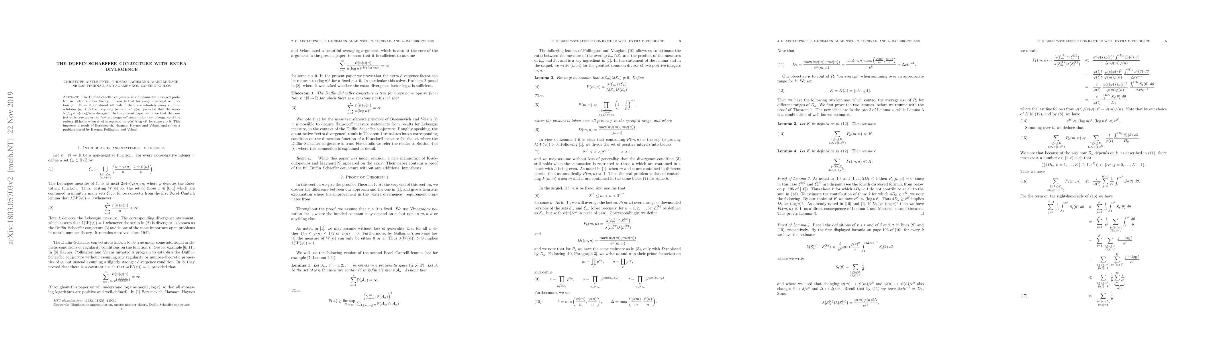 The paper proves the Duffin-Schaeffer conjecture under an 'extra divergence' assumption, improving previous results and solving a problem posed by Haynes, Pollington, and Velani.