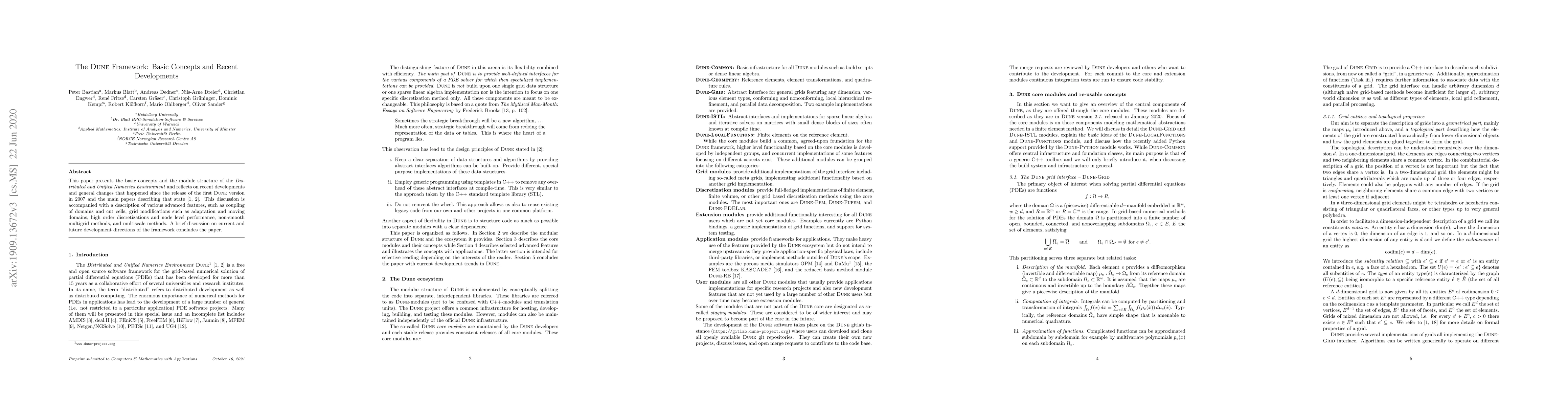 The DUNE Framework is a distributed and unified numerics environment, with a detailed overview of its module structure and recent advancements since its 2007 release. It includes advanced features like domain coupling, grid adaptation, high-order discretizations, and multiscale methods, with a discussion on ongoing and future developments.