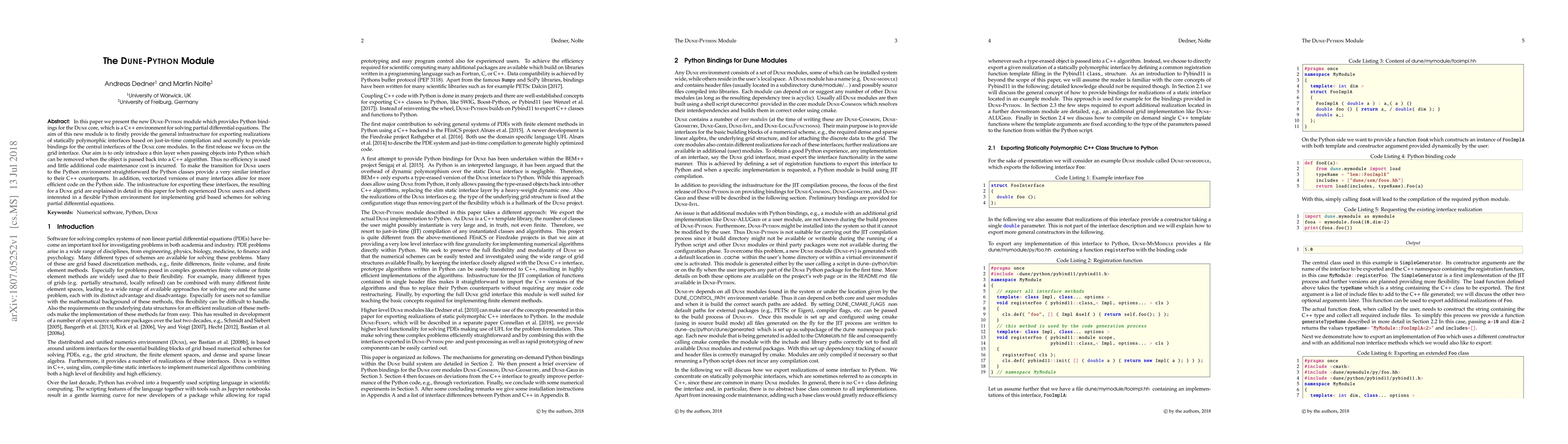 This paper introduces the Dune-Python module, providing Python bindings for the Dune C++ environment used for solving partial differential equations. The module aims to offer a thin layer for efficient object passing between Python and C++, maintaining similar interfaces to ease the transition for Dune users.