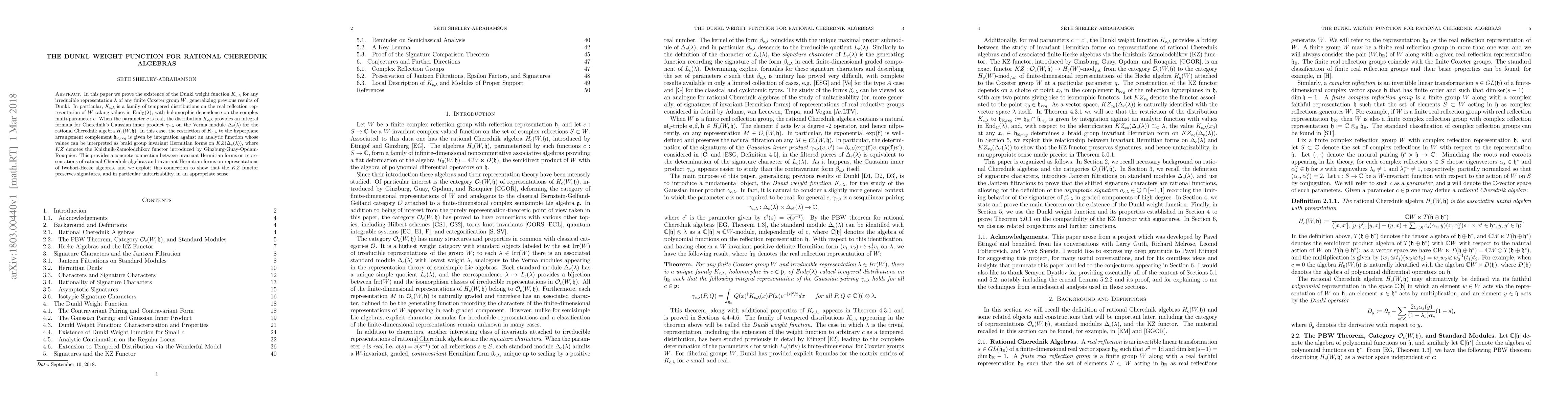 This paper establishes the existence of the Dunkl weight function $K_{c, \lambda}$ for any irreducible representation of a finite Coxeter group, generalizing previous results. It provides an integral formula for Cherednik's Gaussian inner product and establishes a concrete connection between invariant Hermitian forms on rational Cherednik algebras and Iwahori-Hecke algebras, showing that the Knizhnik-Zamolodchikov functor preserves unitarizability.