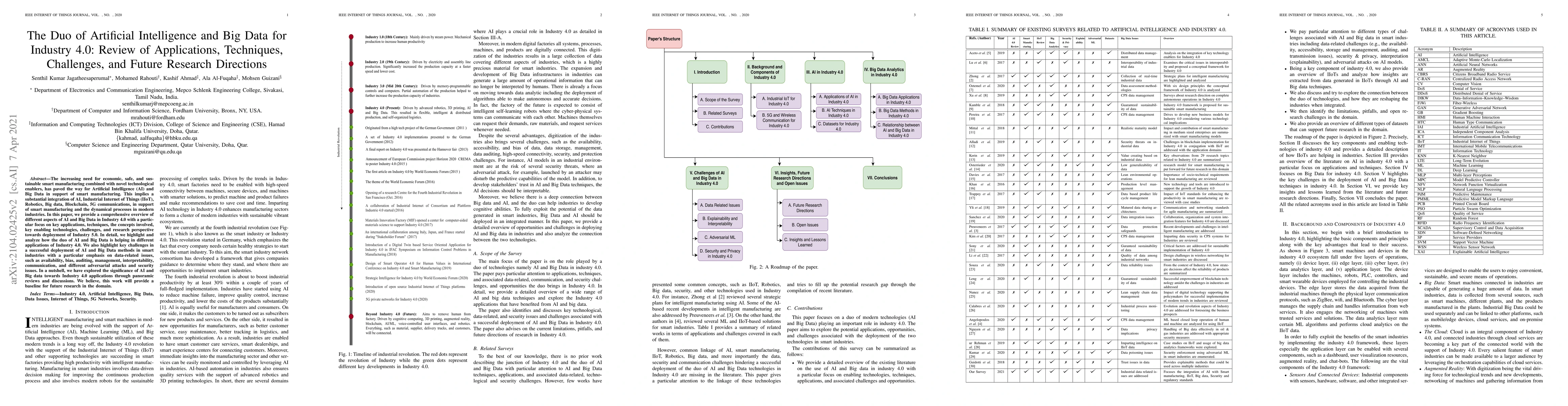 This paper reviews the integration of Artificial Intelligence and Big Data in Industry 4.0, focusing on applications, techniques, and challenges. It highlights key enabling technologies and discusses data-related issues, aiming to provide a foundation for future research in Industry 5.0.