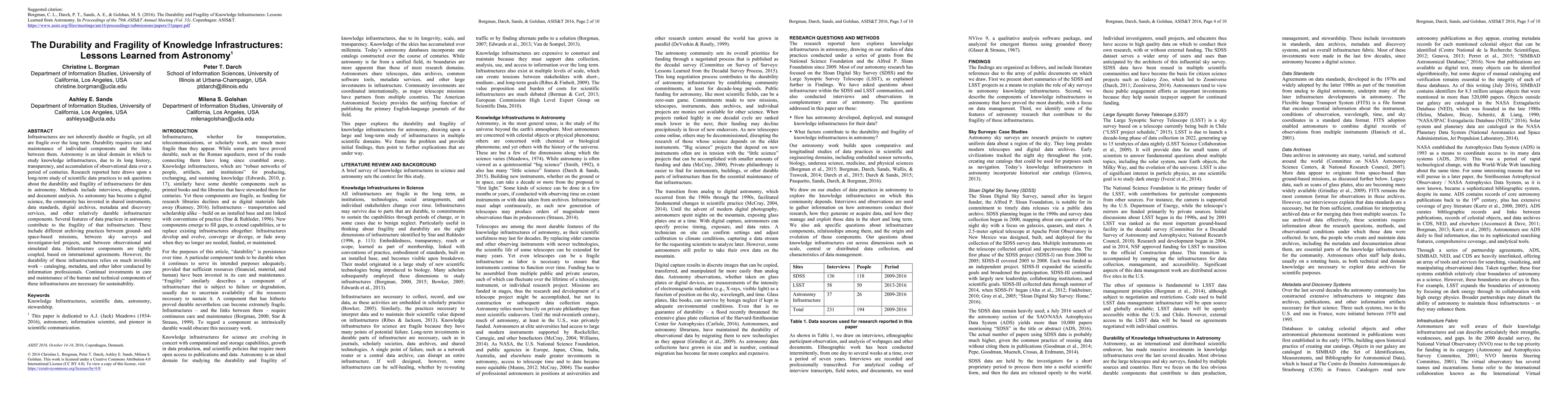 This paper examines the durability and fragility of knowledge infrastructures in astronomy, highlighting that while infrastructure components can be relatively durable, their long-term sustainability depends on continuous maintenance and invisible work by information professionals. The study reveals that despite shared instruments and data standards, differences in archiving practices and tight coupling of components contribute to the fragility of the infrastructure.