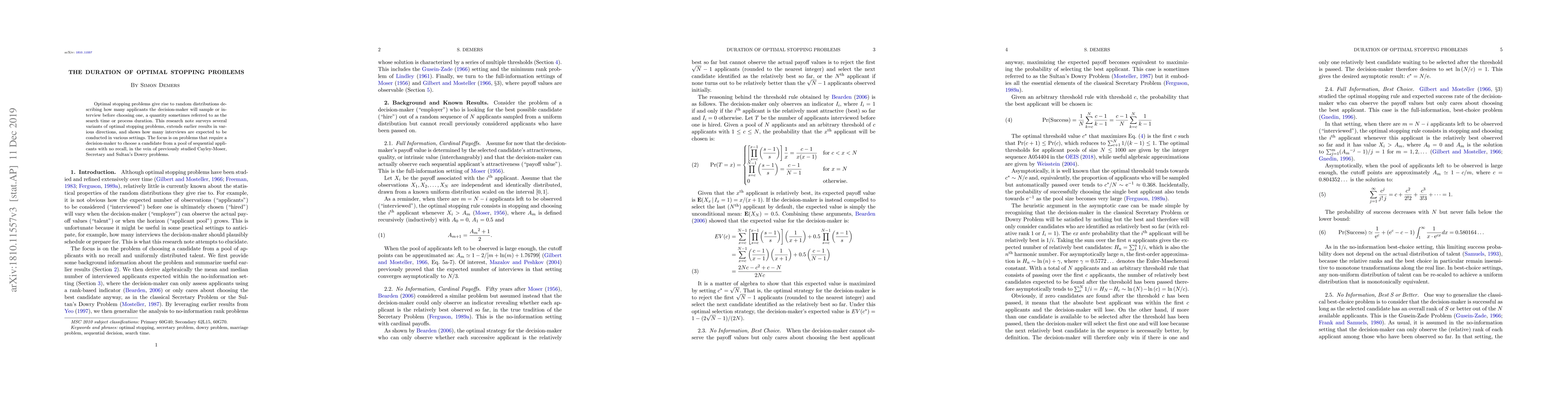 This paper surveys optimal stopping problems, particularly focusing on the search time or duration of interviews needed to select the best candidate from a sequential pool, extending previous results and analyzing various settings like the Secretary and Sultan's Dowry problems. It provides insights into the expected number of interviews required.
