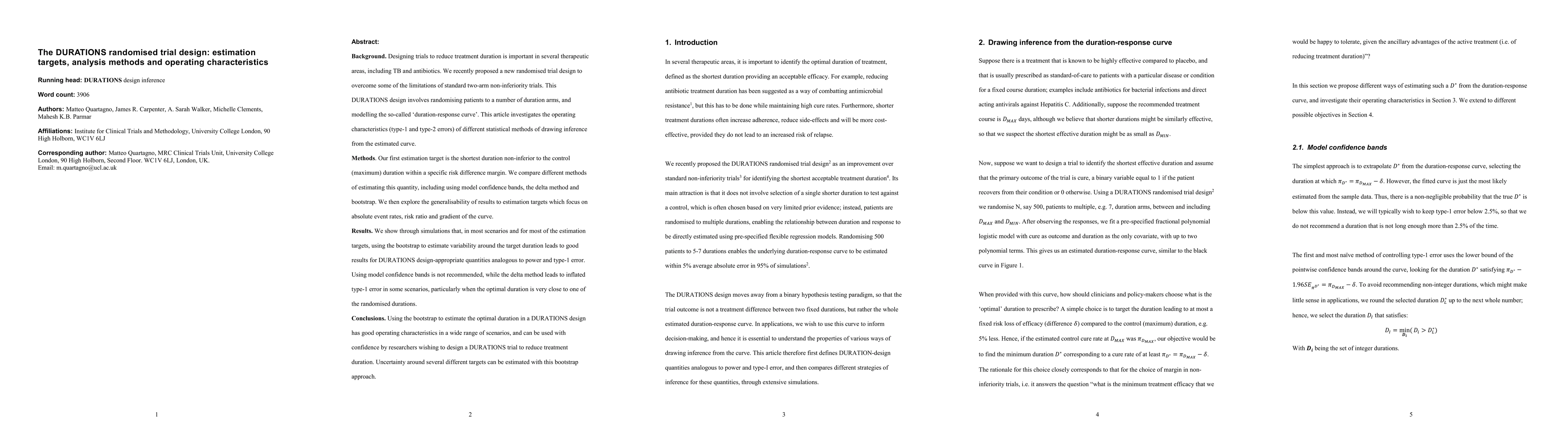 Background. Designing trials to reduce treatment duration is important in several therapeutic areas, including TB and antibiotics. We recently proposed a new randomised trial design to overcome some of the limitations of standard two-arm non-inferiority trials. This DURATIONS design involves randomising patients to a number of duration arms, and modelling the so-called duration-response curve. This article investigates the operating characteristics (type-1 and type-2 errors) of different statistical methods of drawing inference from the estimated curve. Methods. Our first estimation target is the shortest duration non-inferior to the control (maximum) duration within a specific risk difference margin. We compare different methods of estimating this quantity, including using model confidence bands, the delta method and bootstrap. We then explore the generalisability of results to estimation targets which focus on absolute event rates, risk ratio and gradient of the curve. Results. We show through simulations that, in most scenarios and for most of the estimation targets, using the bootstrap to estimate variability around the target duration leads to good results for DURATIONS design-appropriate quantities analogous to power and type-1 error. Using model confidence bands is not recommended, while the delta method leads to inflated type-1 error in some scenarios, particularly when the optimal duration is very close to one of the randomised durations. Conclusions. Using the bootstrap to estimate the optimal duration in a DURATIONS design has good operating characteristics in a wide range of scenarios, and can be used with confidence by researchers wishing to design a DURATIONS trial to reduce treatment duration. Uncertainty around several different targets can be estimated with this bootstrap approach.