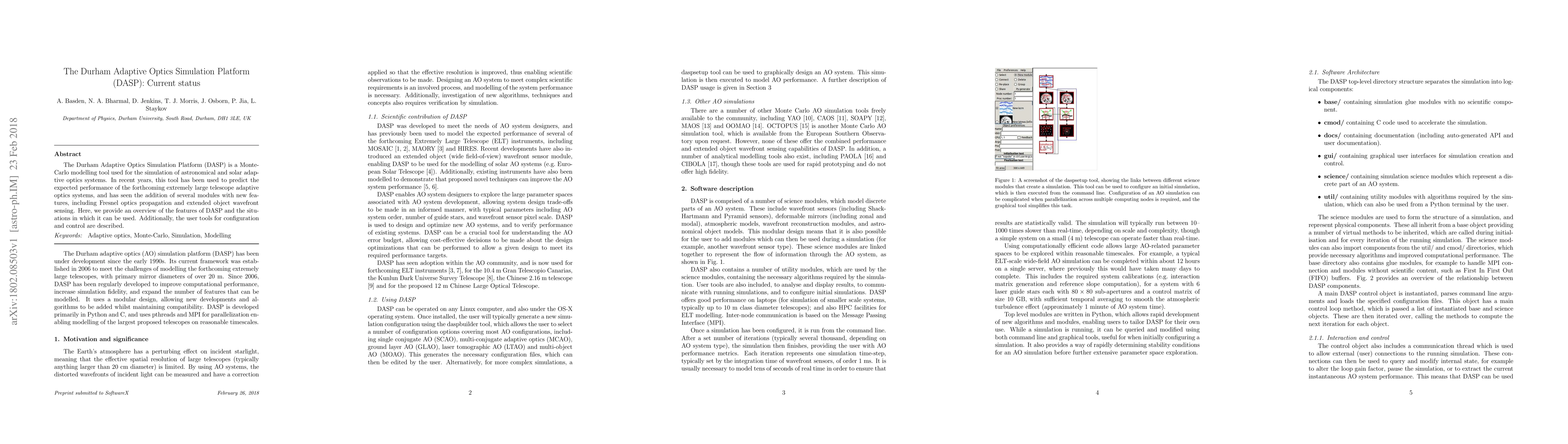 The Durham Adaptive Optics Simulation Platform (DASP) is a Monte-Carlo modelling tool for simulating astronomical and solar adaptive optics systems, recently enhanced with new features like Fresnel optics propagation and extended object wavefront sensing. This paper provides an overview of DASP's capabilities and user tools for configuration and control.